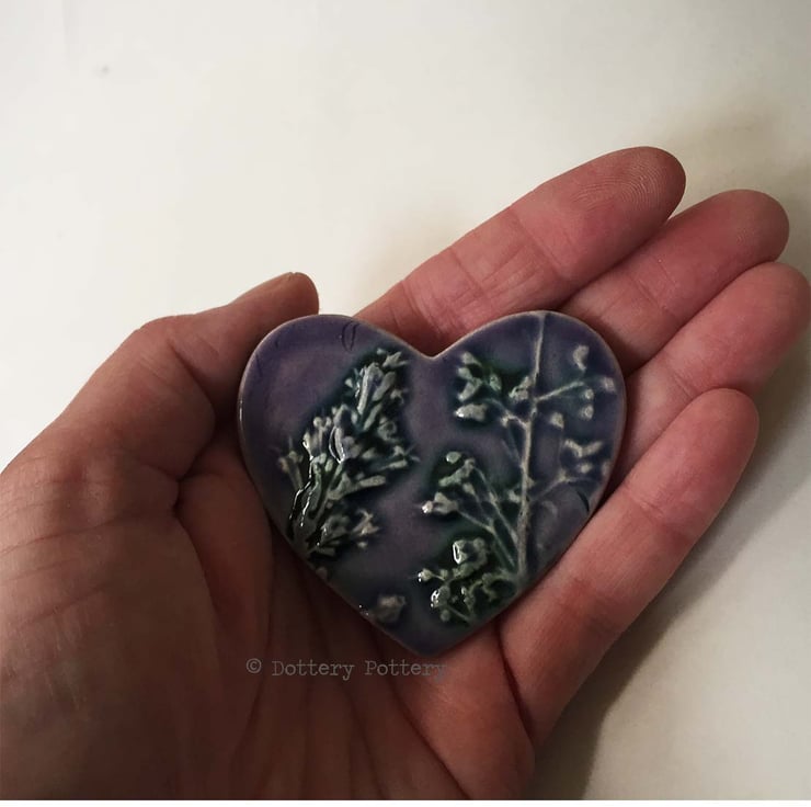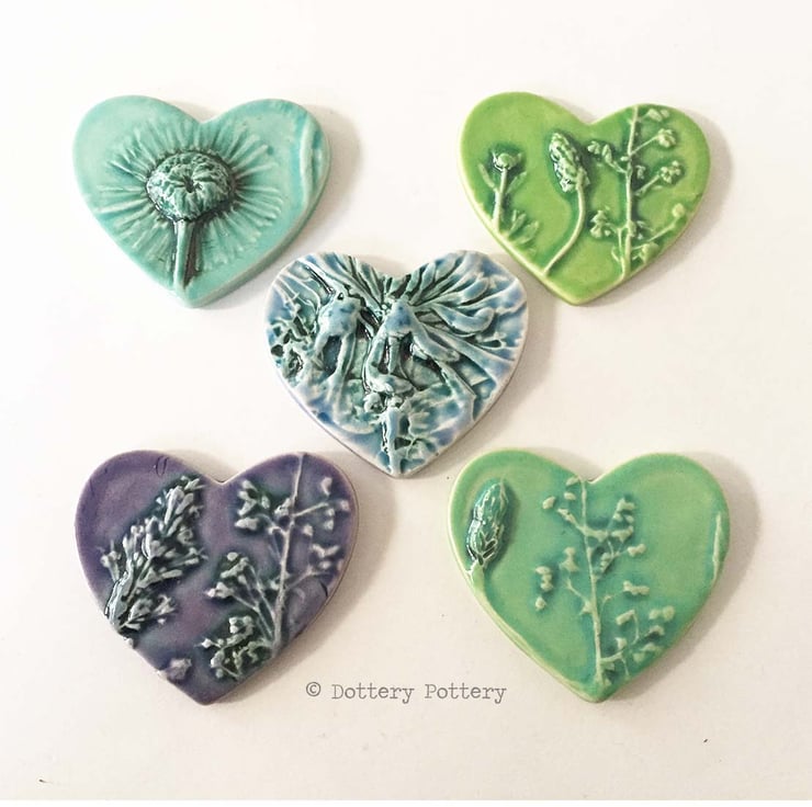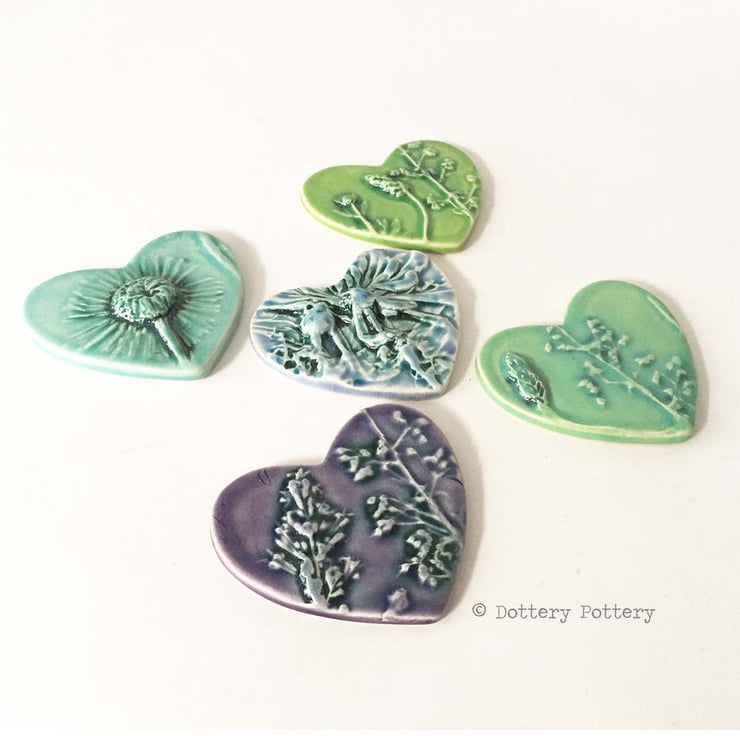 This set of five little ceramic tiles are made from white earthenware clay and fired to a top temperature of 1100 degrees. They have been imprinted with natural flower designs and finished in lovely, shiny glazes in shades of blue green and purple. Would be suitable to frame or use for other craft projects Each tile measures 5.5cm x 6cm x up to 1.2 cm deep.