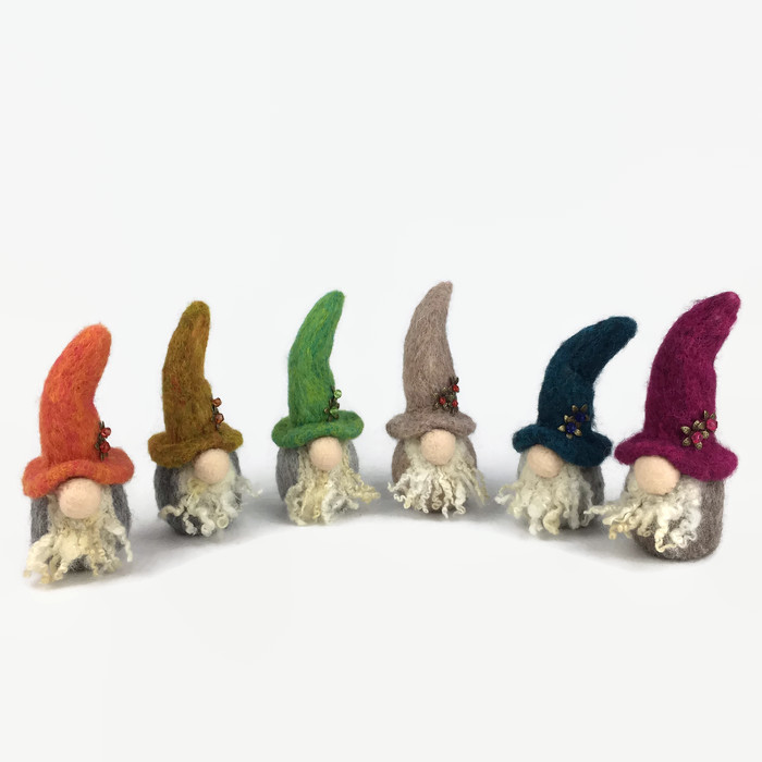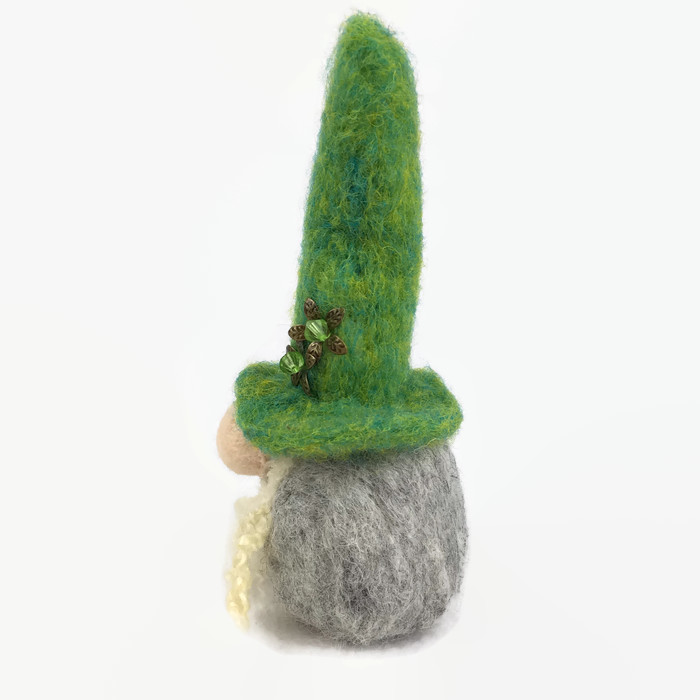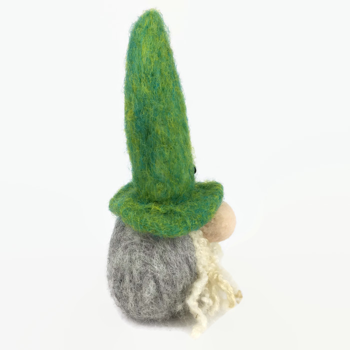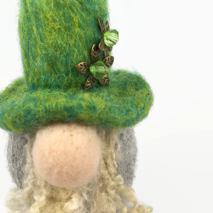 Needle felted from woollen fibres, this swedish tomte has sculpted into shape using a barbed felting needle. He has a grey body and bright green hat. Two flowers, made from antique bronze effect petals with beaded centres, have been added to the hat as decoration. The tomte has a bulbous pink nose and a curly white beard.