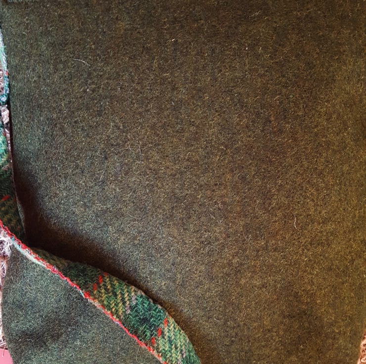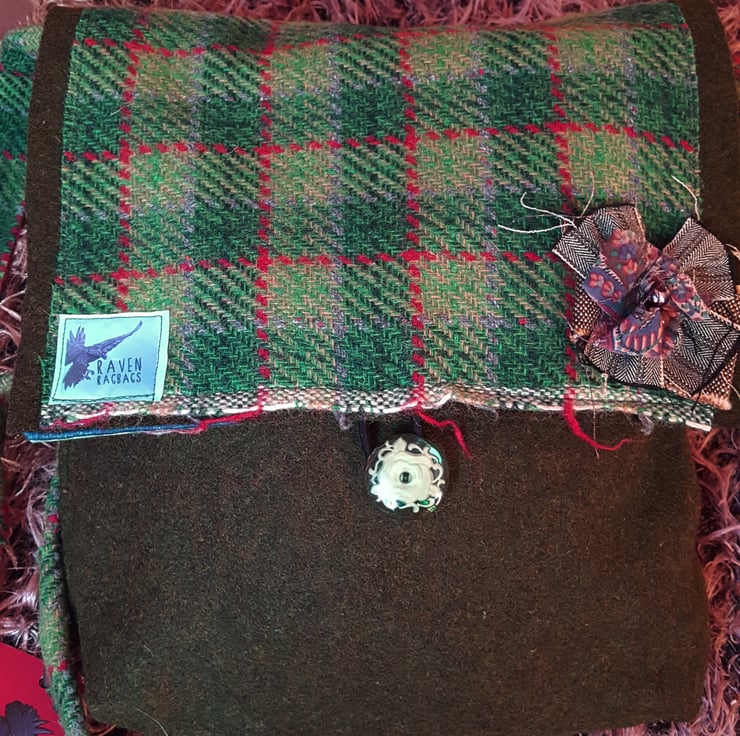 This is a real Highland beauty, handmade from a gorgeous green and red tartan and teamed with a beautiful muted green wool fabric, this bag is a real stunner. The bag measures 29 cm wide by 30 cm deep and has a comfortable tartan shoulder strap measuring 130 cm. The bag fastens with a striking green button and loop and is fully lined with a green and gold fabric and has a triple inside pocket for your phone, pens and bits and pieces. The front flap is adorned with an unusual fabric flower and bead brooch. A very stylish and exclusive bag.