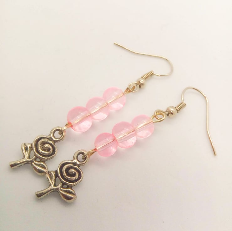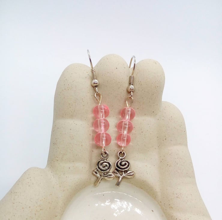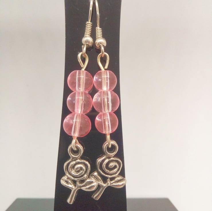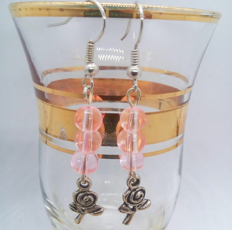 The earrings are made using a pink glass round beads with a silver plated rose charm, hung on silver plated ear wires and they have a drop of 4 cm.
