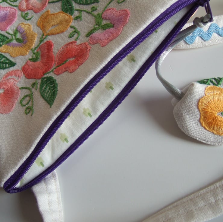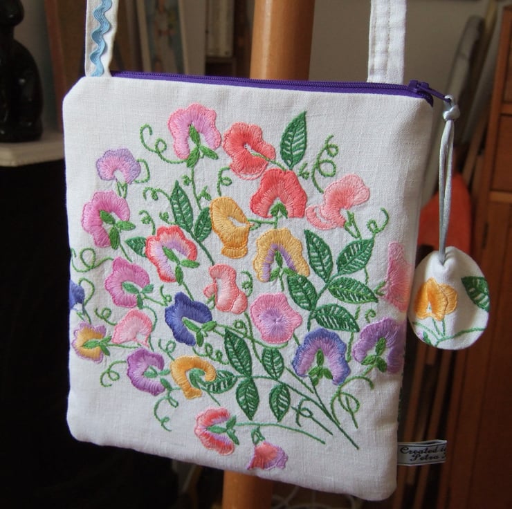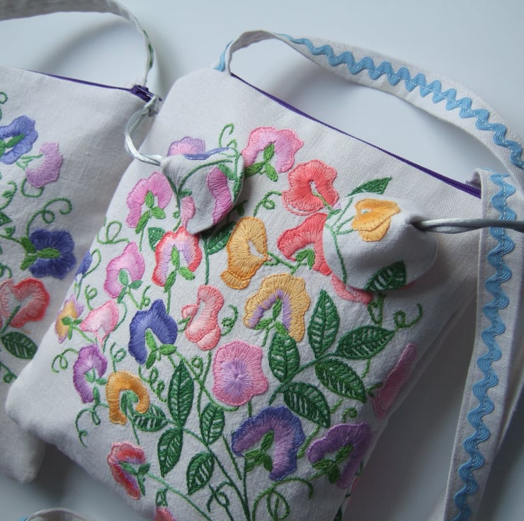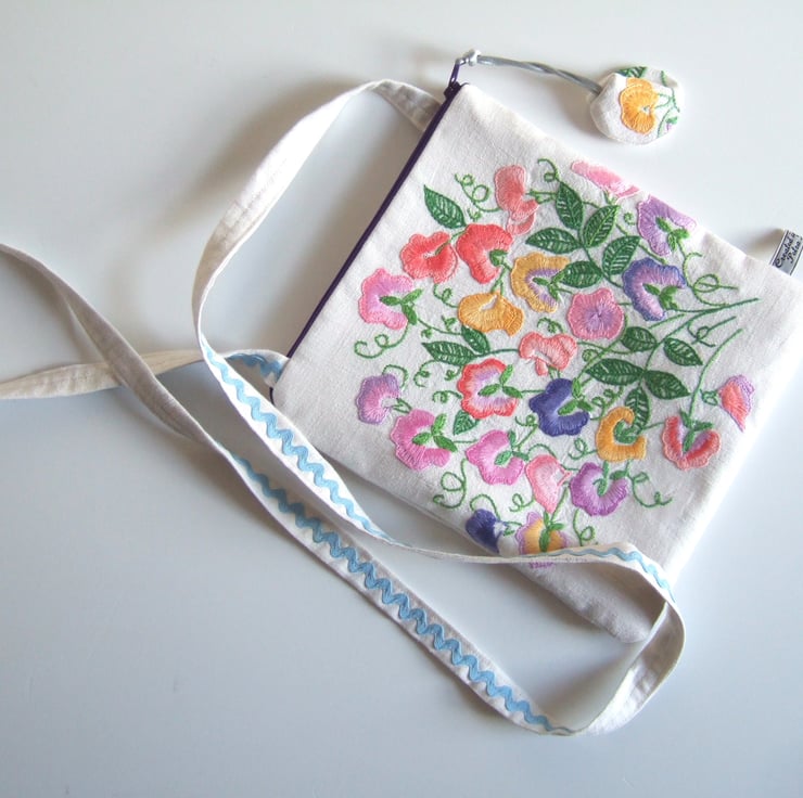 This across your body bag is covered in vintage sweet pea embroidery.Perfect for special occasions, weddings or Summer Festivals.