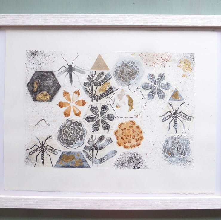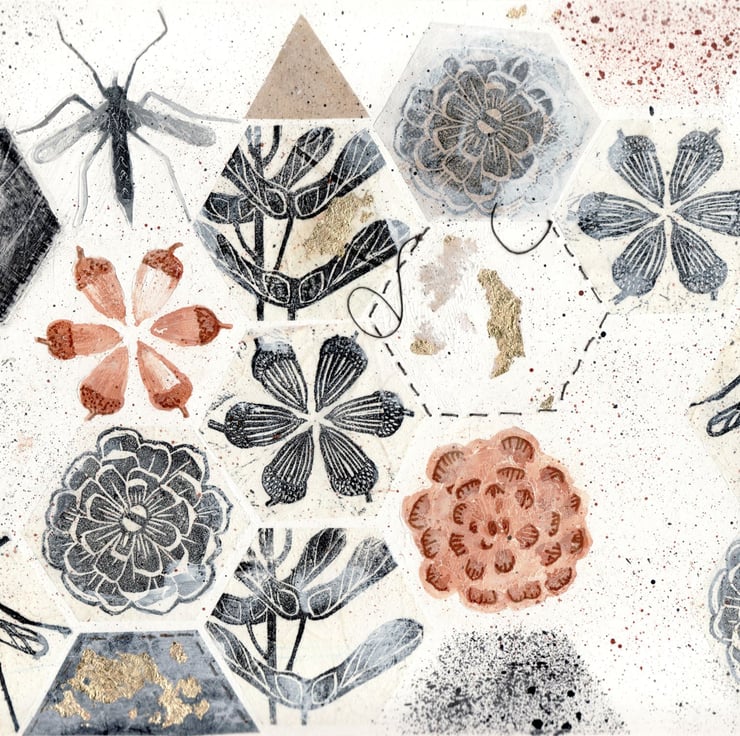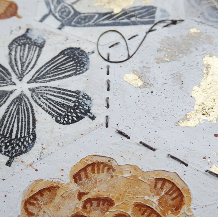 A collage of tiny lino prints on textured gesso with watercolour, stitch and foil accents.