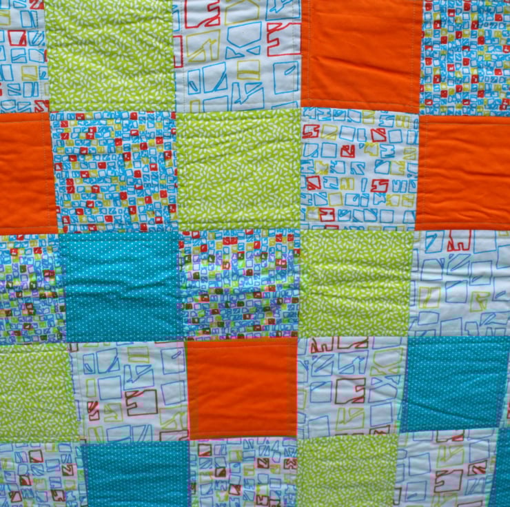 The quilt is orange, turquoise and lime green cotton fabric. The abstract fabric is upcycled African cotton fabric.