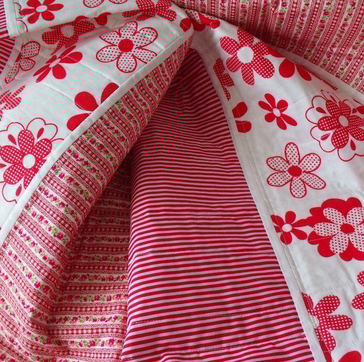This quilt can be used as a cot quilt, to throw over the bottom of a single bed to inject some colour into the room, a chair throw, a lap quilt, to drape over the back of the sofa or a play mat for baby.