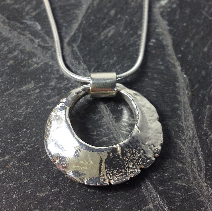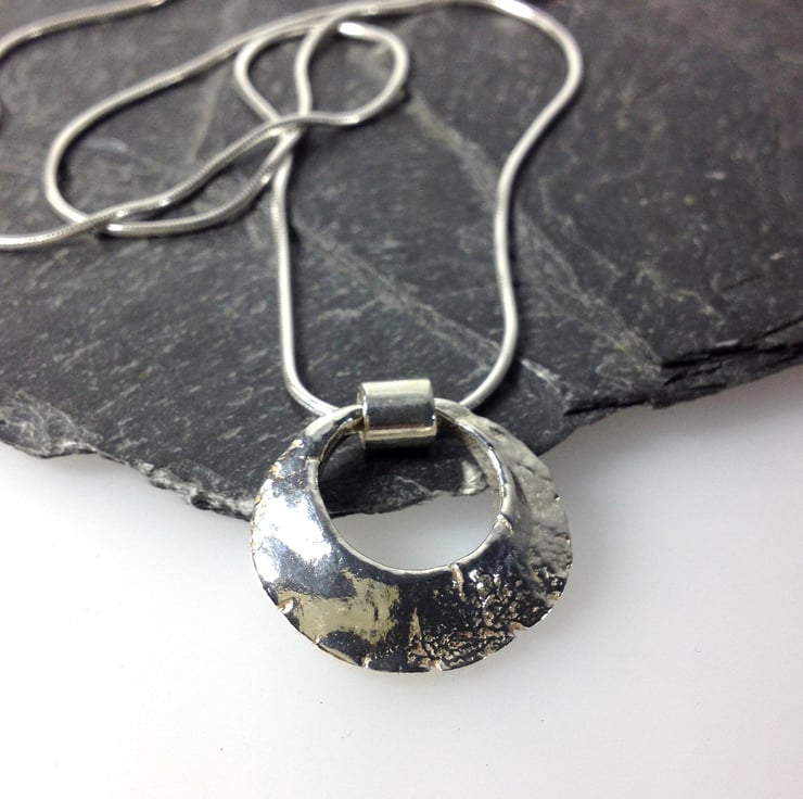 I have sculpted this solid ring pendant then cast it in sterling silver, it has a lovely weight and a weathered aged appearance, it measures just over 2 cm diameter and is over 4mm thick in the centre, tapering to the outer edges.