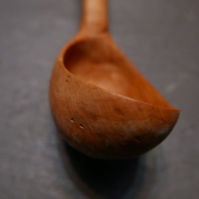 A small scoop / ladle handcarved from field hawthorn branchwood with a hanging hook incorporated into the handle.