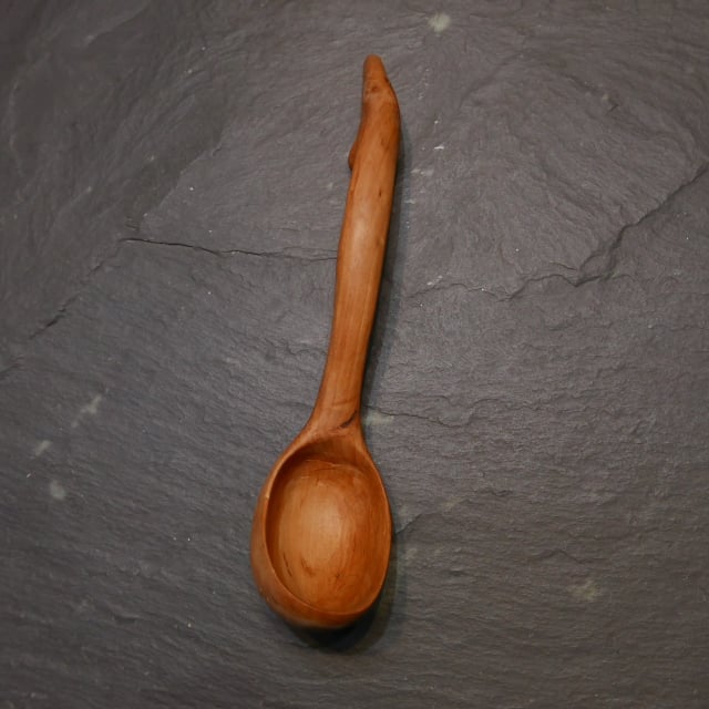 A naturally carved scoop. The handle is from the branchwood of a fallen hawthorn and the bowl was carved from the stemwood.