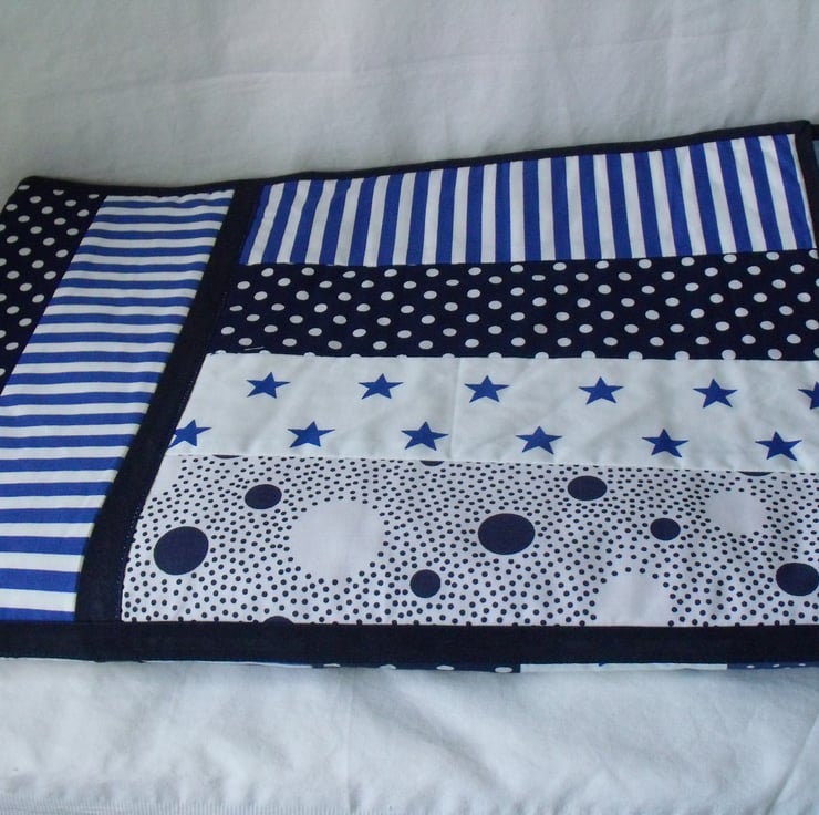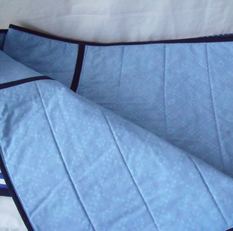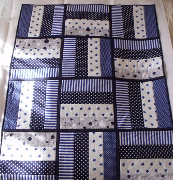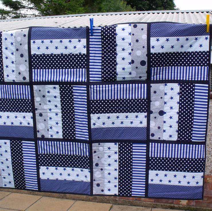 Here we have a patchwork quilt, quilted throw in blue and white. Great for a boys room.