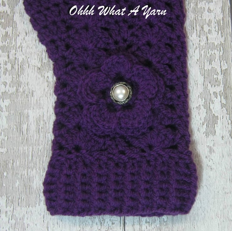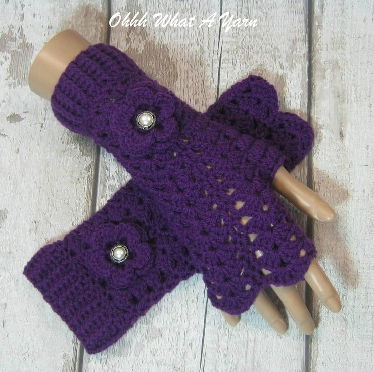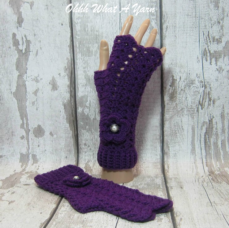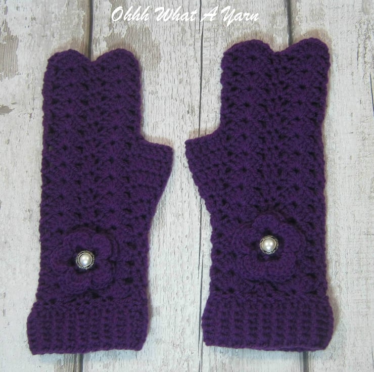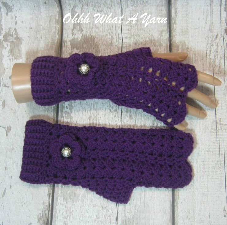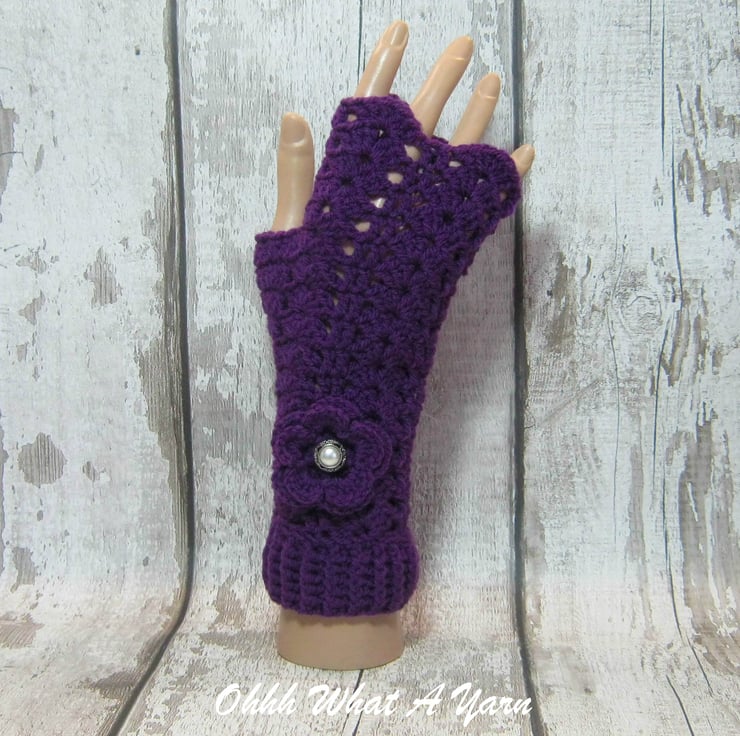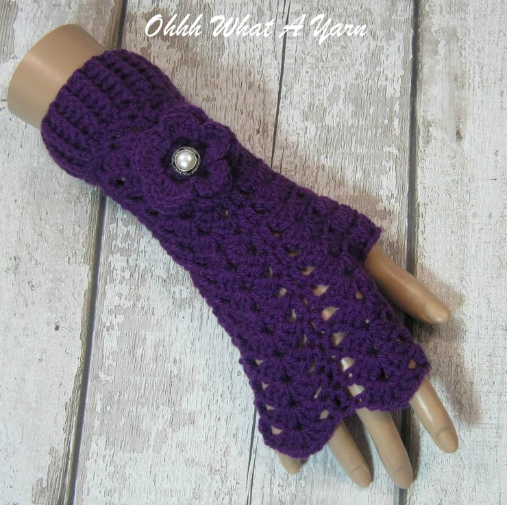 Gorgeous purple finger less gloves. These stunning gloves have been crocheted using a beautiful shell stitch pattern, they have a ribbed cuff and a pretty double layered crochet flower with an accent pearl and silver tone button for decoration.