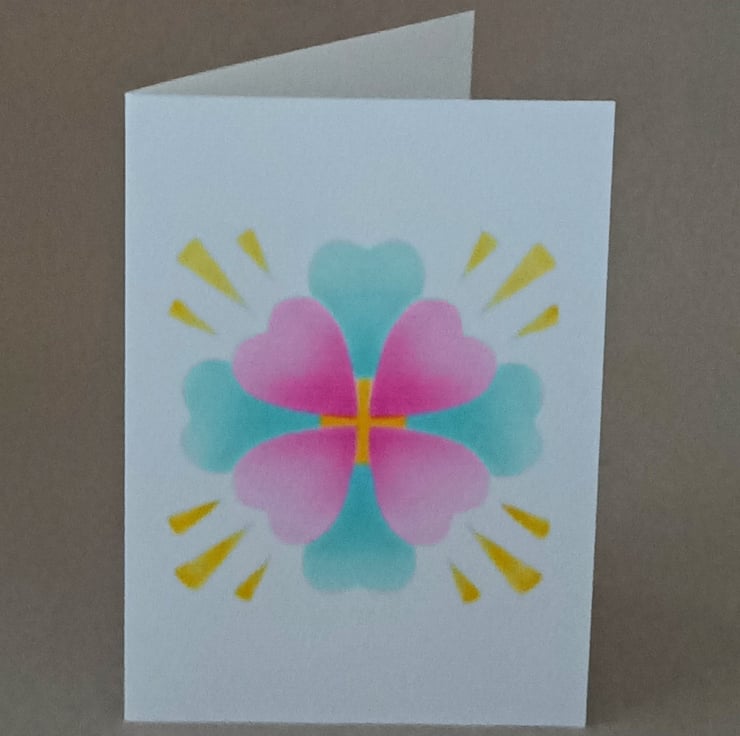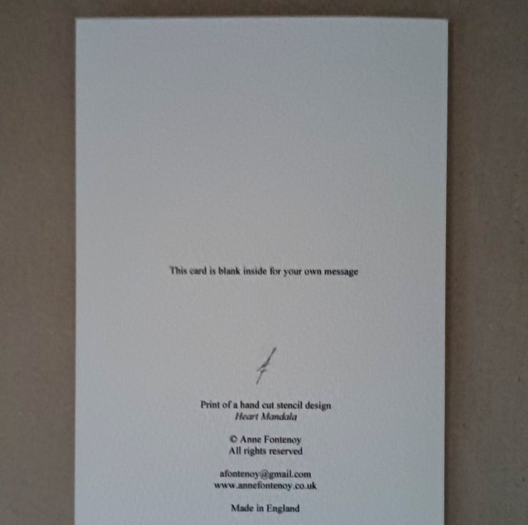 One of my hand cut stencil Mandala cards from a series of 4. This is "Heart Mandala". I made a pencil drawing, made hand cut stencils from it then airbrushed the original design onto fine art paper. I have scanned the artwork and now print the handmade cards myself with Epson Claria inks using an A4 desktop inkjet printer onto a 190 gsm English watercolour digital fine art paper. A lightly textured medium weight card.