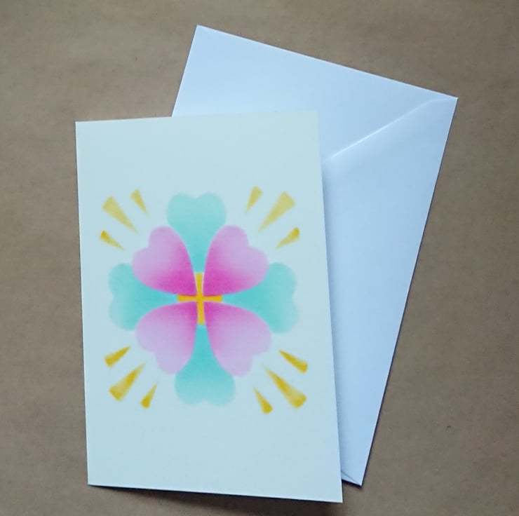 One of my hand cut stencil Mandala cards from a series of 4. This is "Heart Mandala". I made a pencil drawing, made hand cut stencils from it then airbrushed the original design onto fine art paper. I have scanned the artwork and now print the handmade cards myself with Epson Claria inks using an A4 desktop inkjet printer onto a 190 gsm English watercolour digital fine art paper. A lightly textured medium weight card.