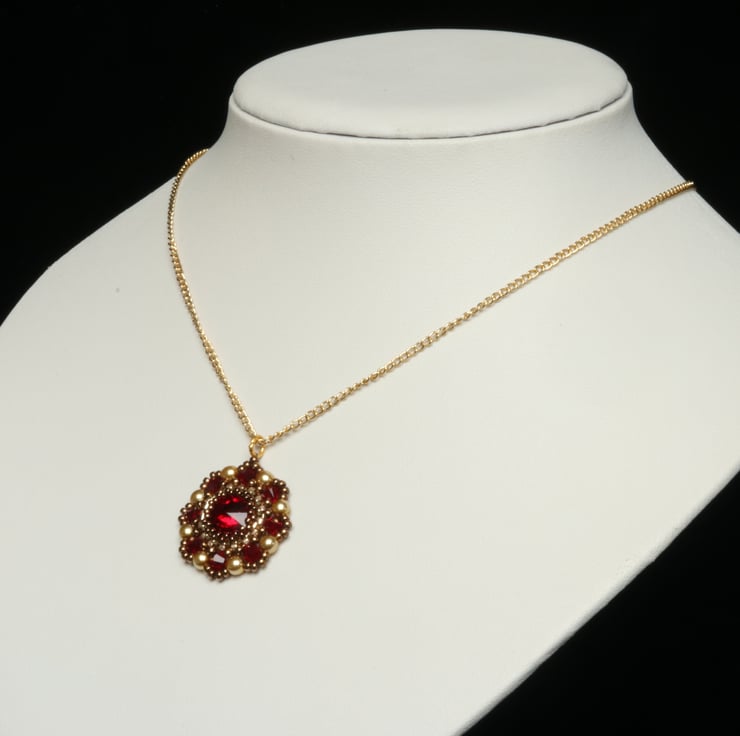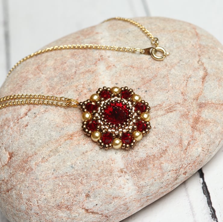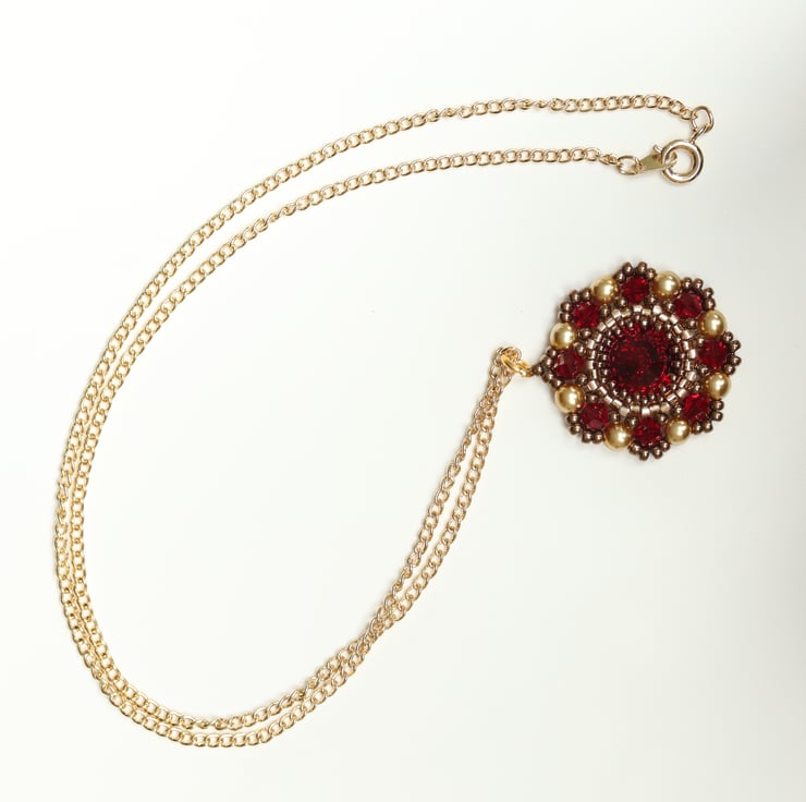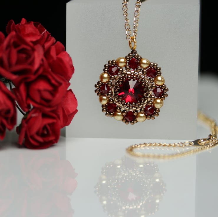I have used deep red Siam Swarovski crystals and gold and bronze seed beads to make this pretty little pendant. It hangs from a gold plated curb chain, which is finished with a matching bolt ring clasp.