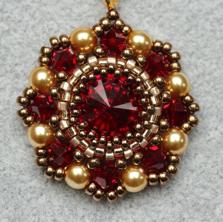 This pendant is made using a tutorial from Deb Roberti at ‘Around the Beading Table’. She calls her pattern the ‘Holiday Medallion’. Deb gives permission for items based on her patterns to be sold by makers.