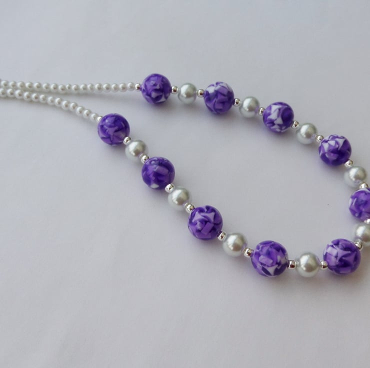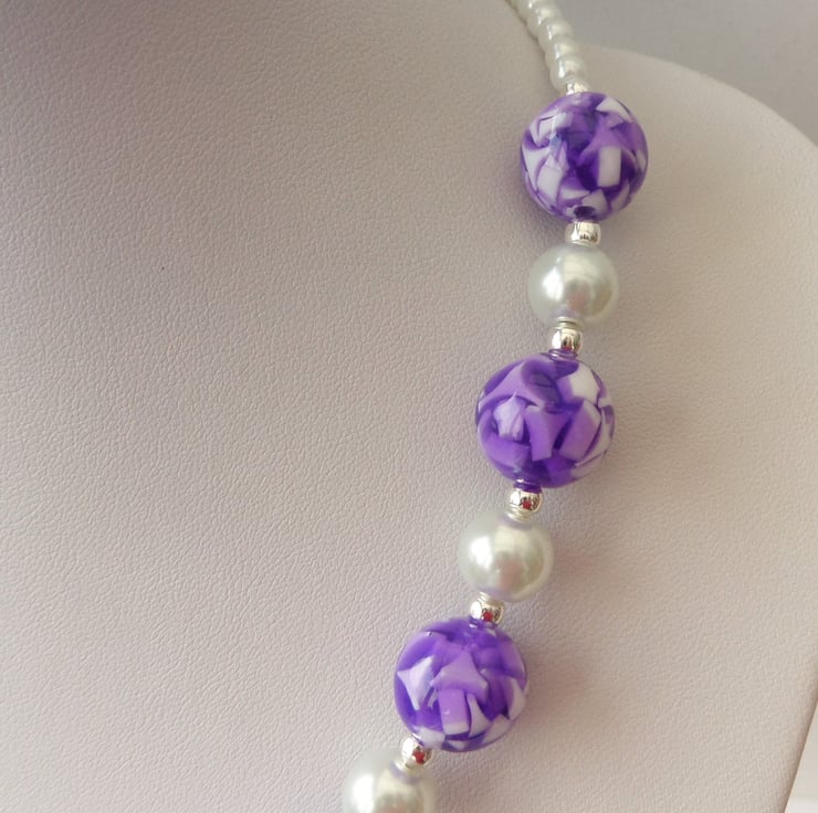 Necklace made using 14mm purple and white acrylic beads, 10mm & 4mm white glass pearls and 4mm silver plated spacer beads.