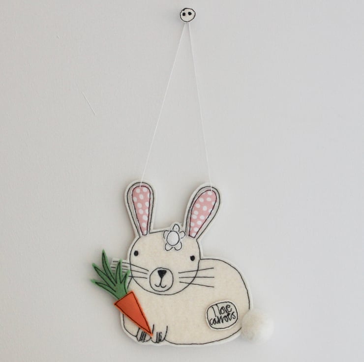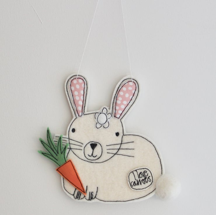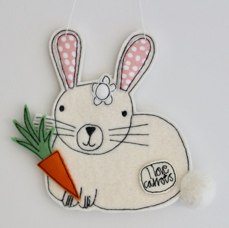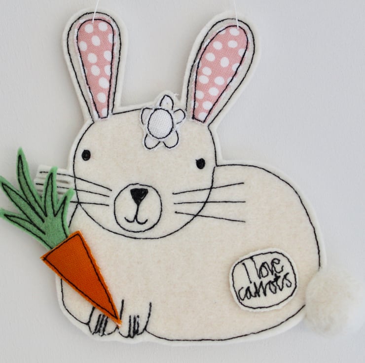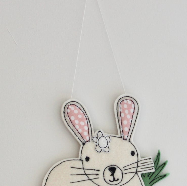 Cream Rabbit is created using 100% wool felt in cream, cotton cloth and free hand machine embroidery.