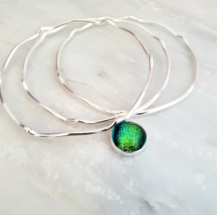 The glass charm has been set on a sterling silver bezel and is attached to one of the bangles, making this set incredibly versatile.