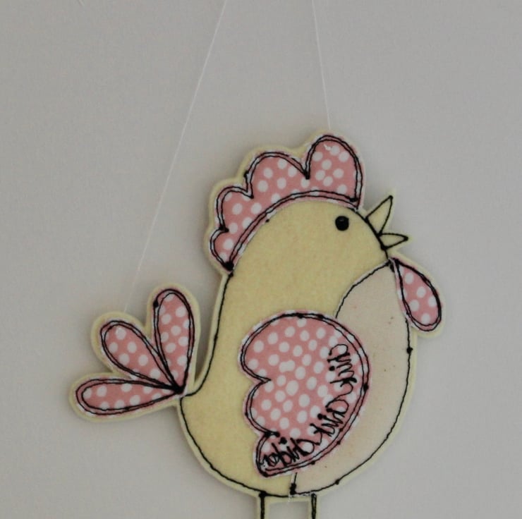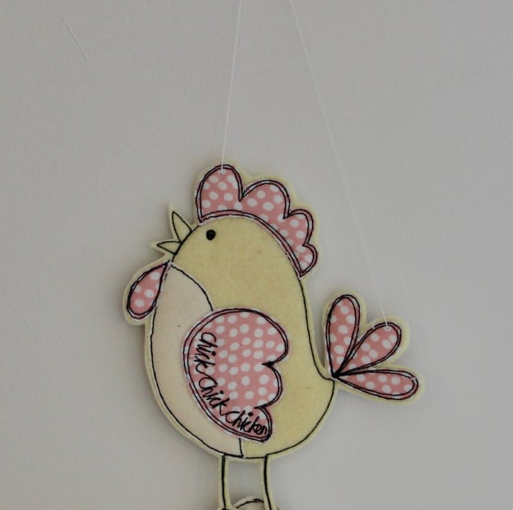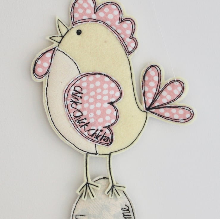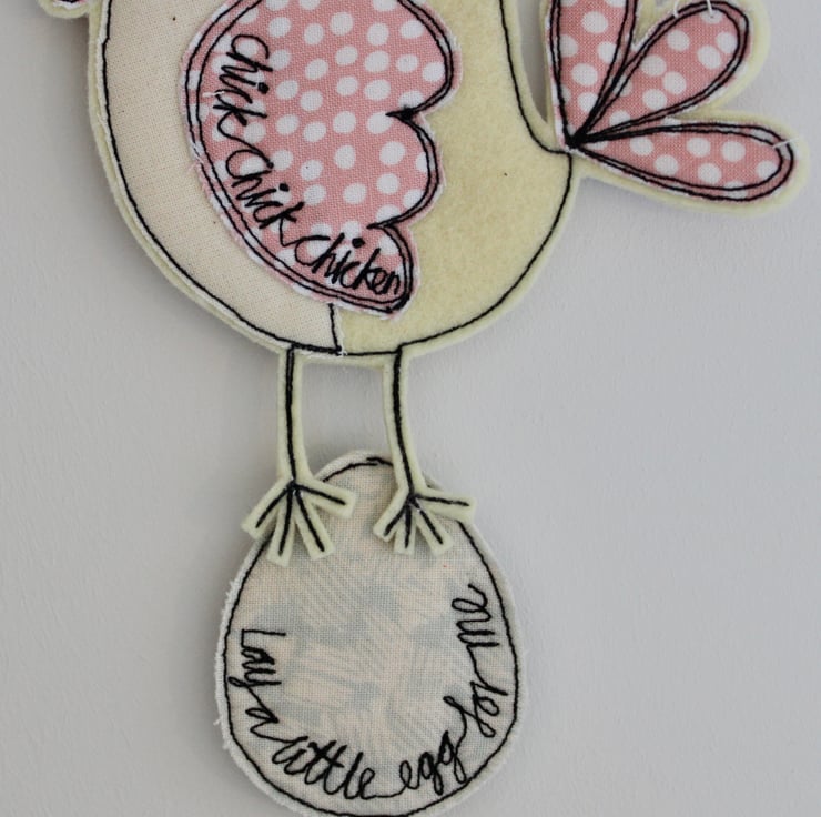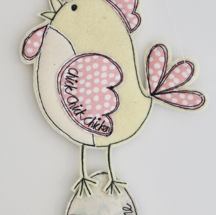 A lemon coloured chicken, is sewn using 100% wool felt, with a cream cotton cloth tummy and a peach dotty wing, tail and plume. 'Chick chick chicken' is sewn on its wing and 'lay a little egg for me' on the fabric egg.