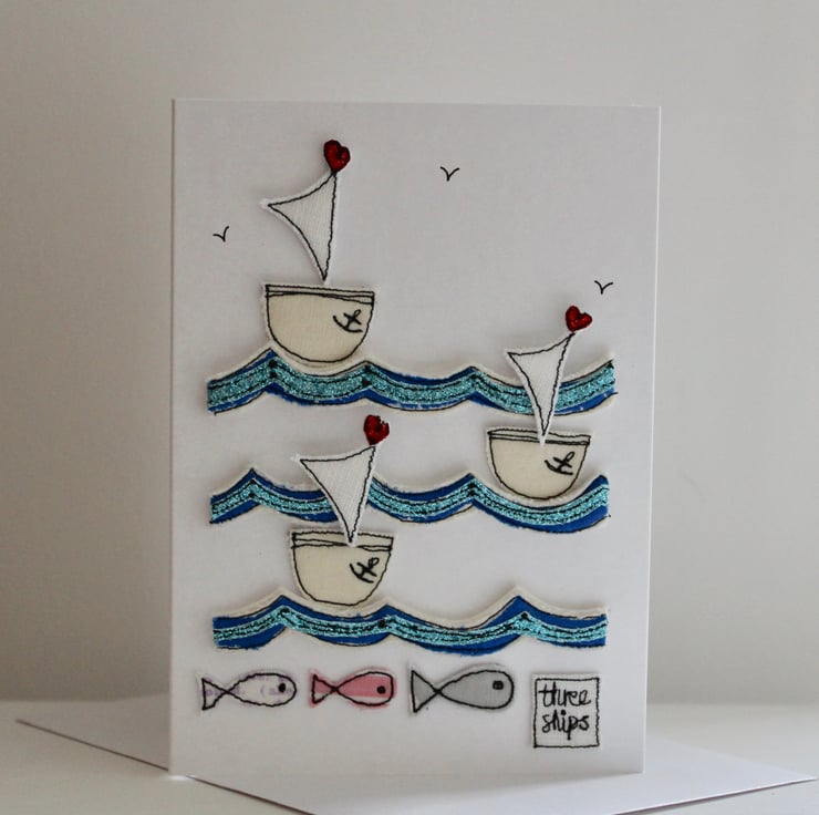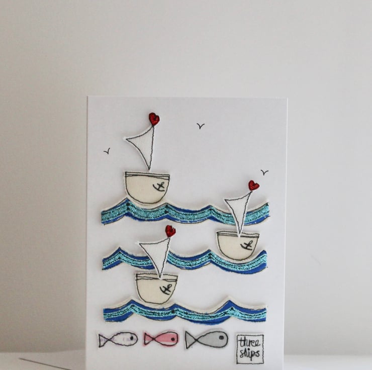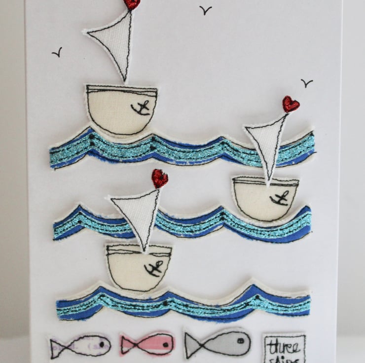 Three sailing boats are floating on a scalloped sea, with three fishes, a sewn label 'three ships' and hand drawn birdies in the sky.