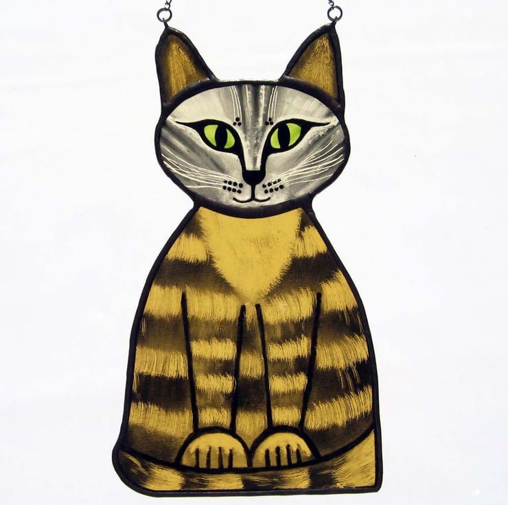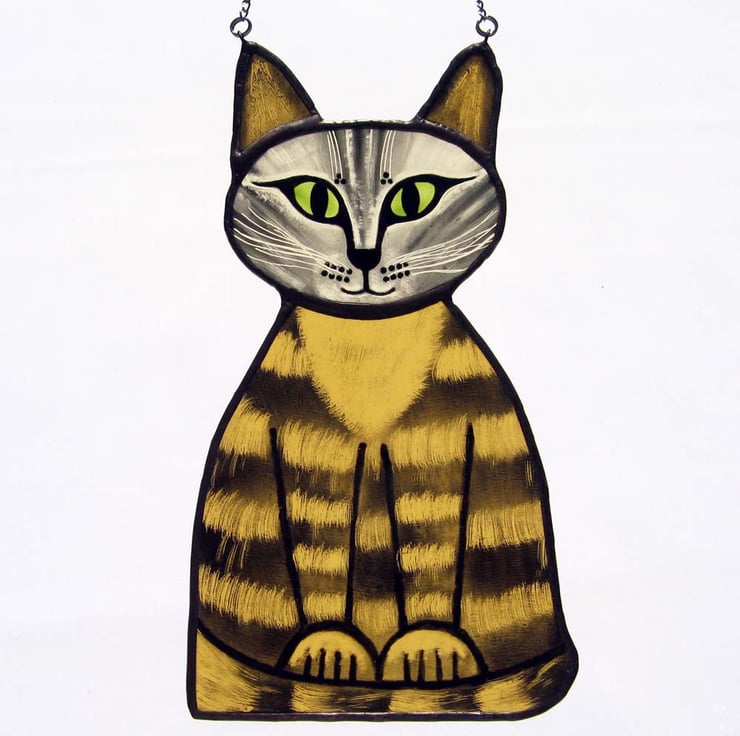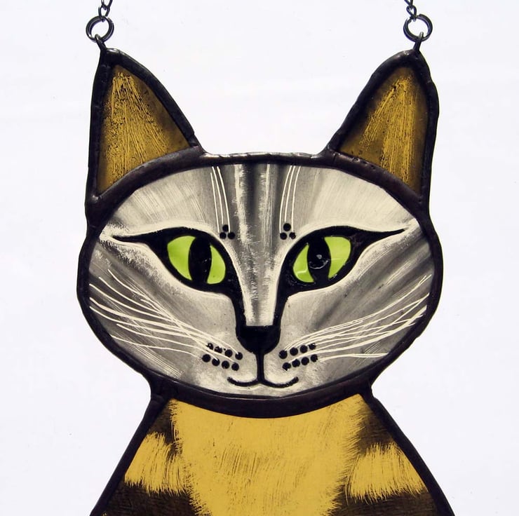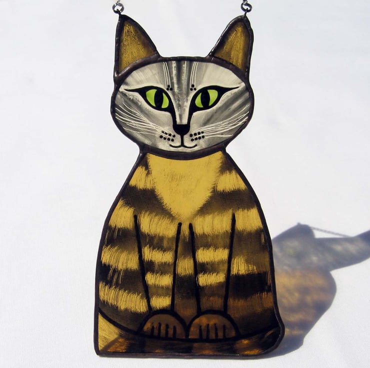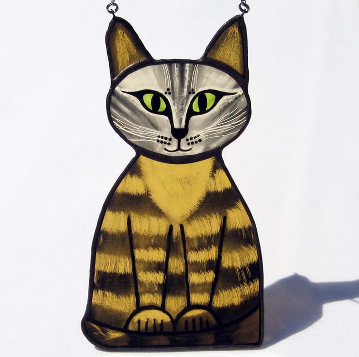 Created using traditional stained glass techniques and materials this amber cat light catcher has been hand painted onto antique style, amber glass and fired in a kiln. The detailed line and shading paint is fired first and in a second firing a touch of colour enamel is added for the cats eyes. At high temperature the paints fuse together with the glass making the image permanent and enduring.