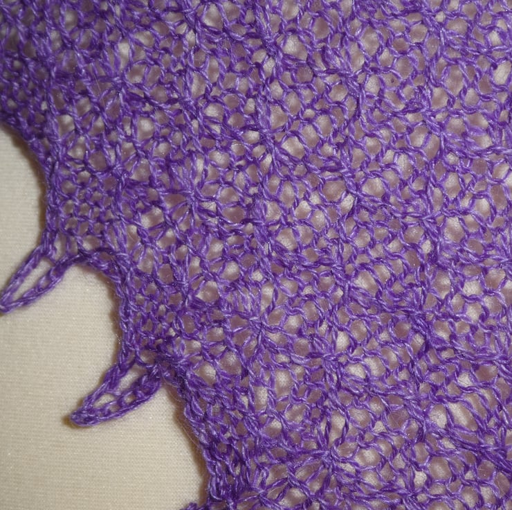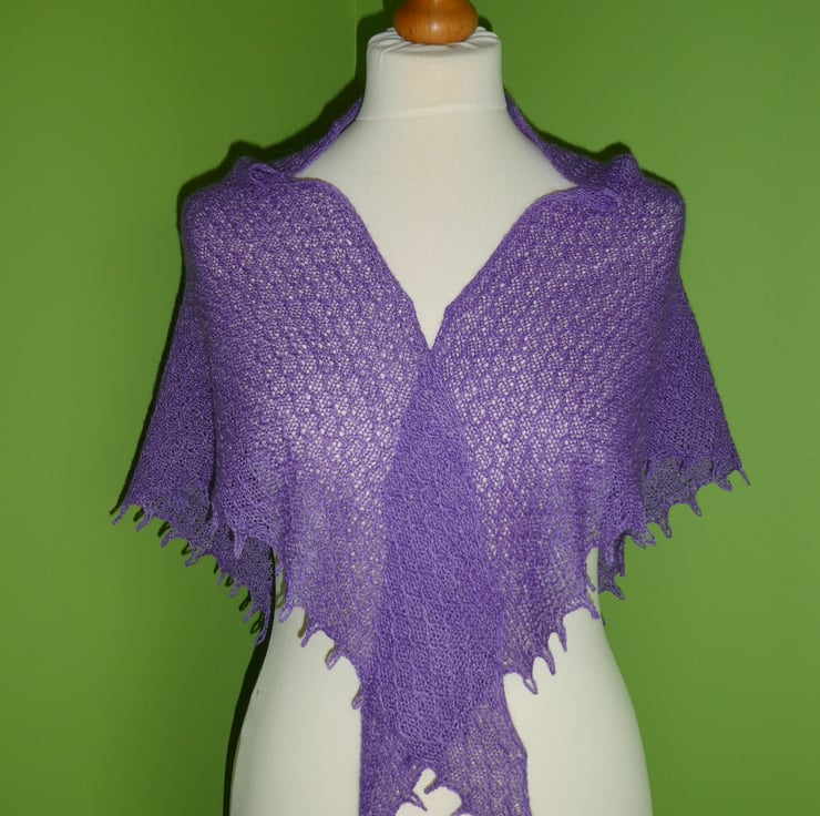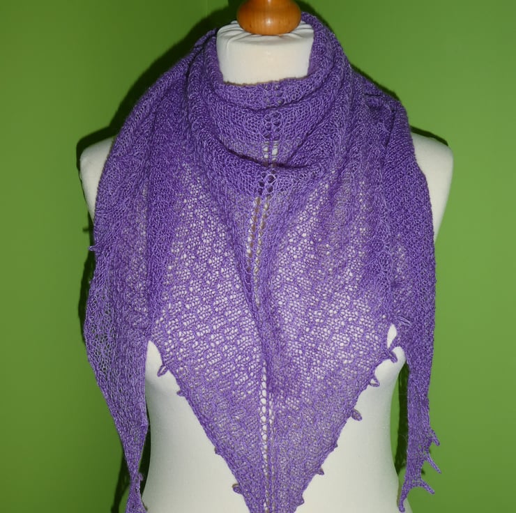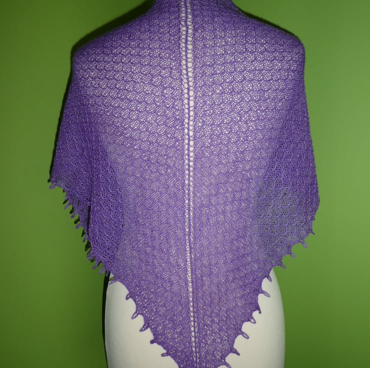I have designed and created this beautiful tuck lace pattern shawl in a lace weight yarn. It is 70% baby alpaca, 25% silk and 5% cashmere blend, making it wonderfully soft. It has been machine knit with an all over punch card lace pattern, to give a light scarf with a lovely drape. The shawl has been hand finished with a crochet edge. The shawl has been washed and blocked and is ready to wear. It measures 60" point to point, and is 27" deep at the widest part of the triangle.