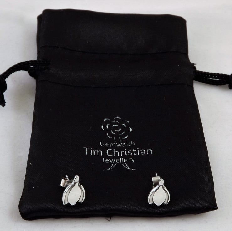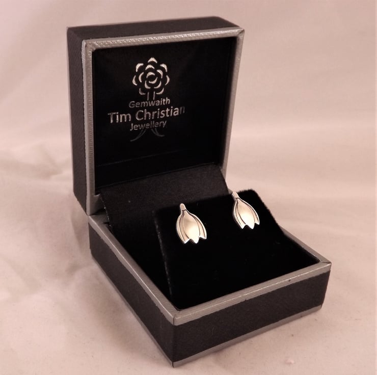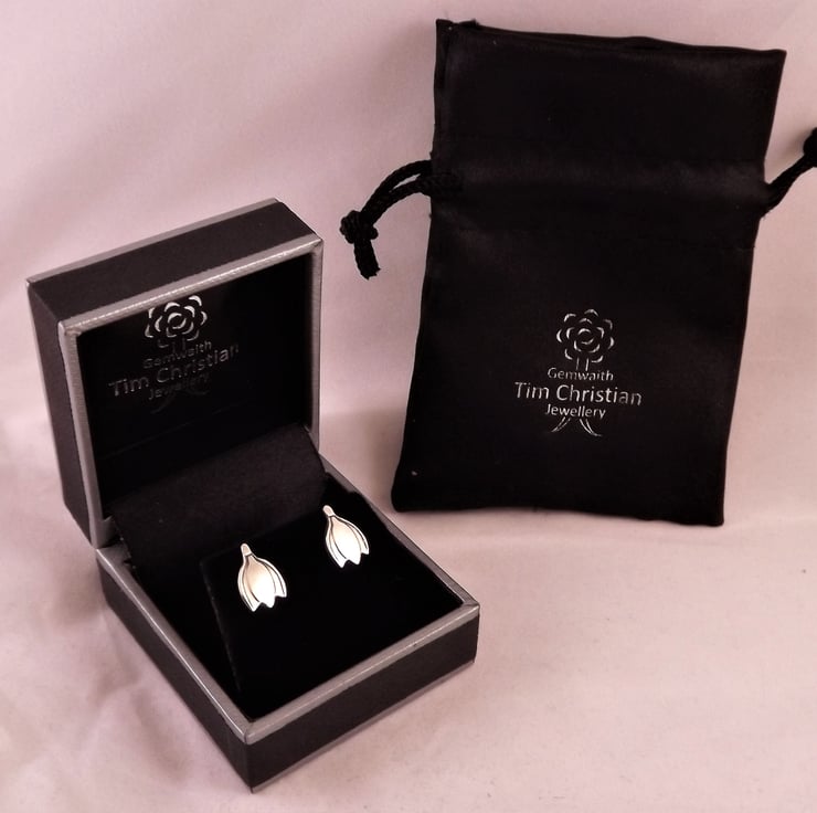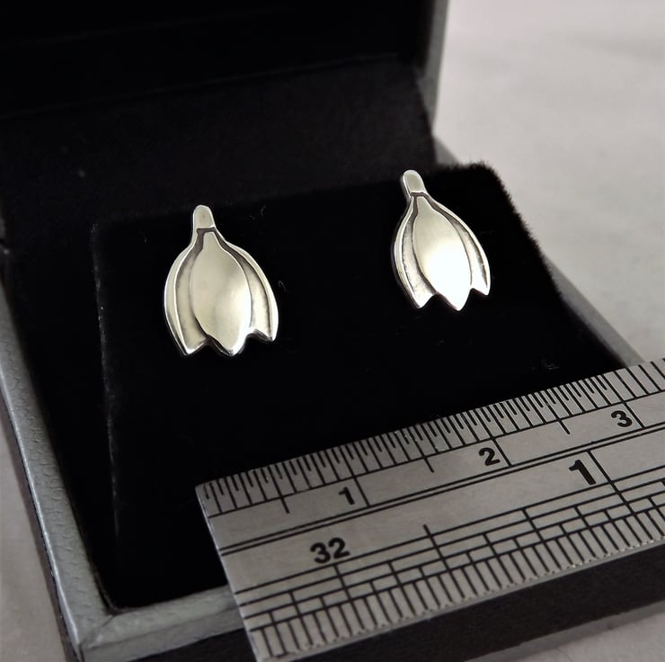 These handmade sterling silver snowdrop stud earrings measure 8mm wide and 12mm high and come in either a branded pouch or gift box.