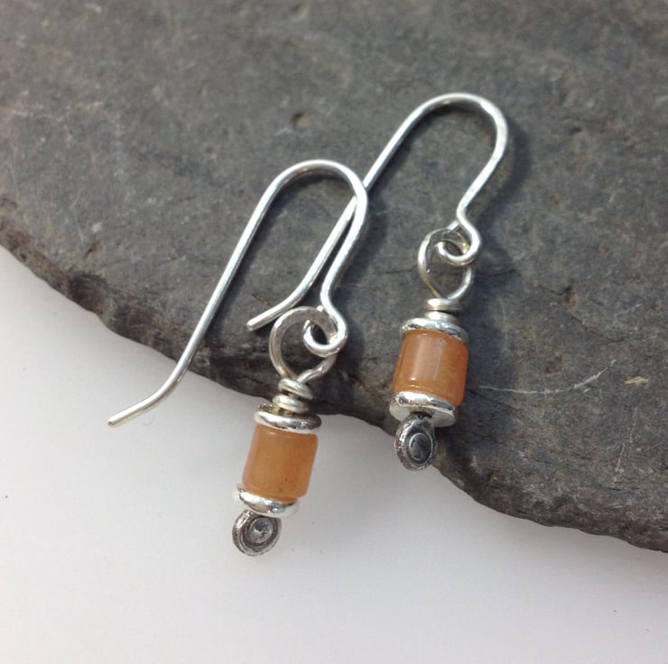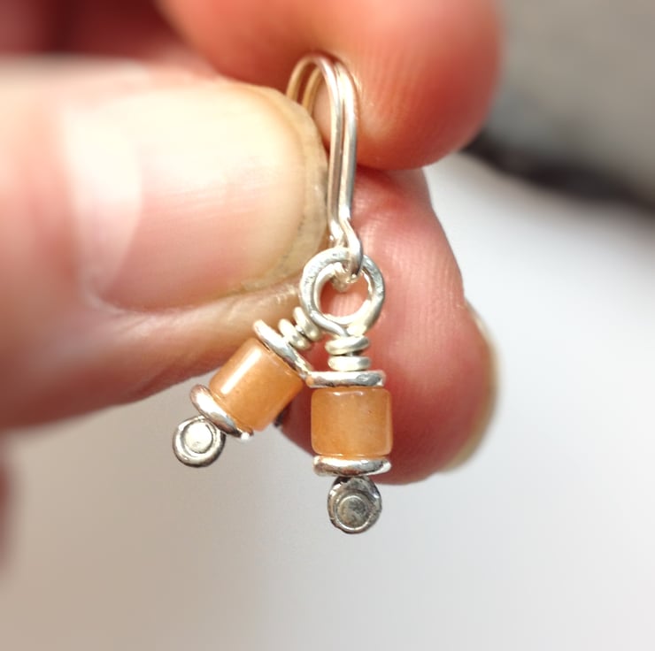 Forged sterling silver pins have been threaded through 5mm silver washer beads and orange aventurine heishi.