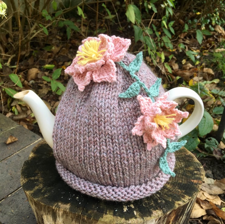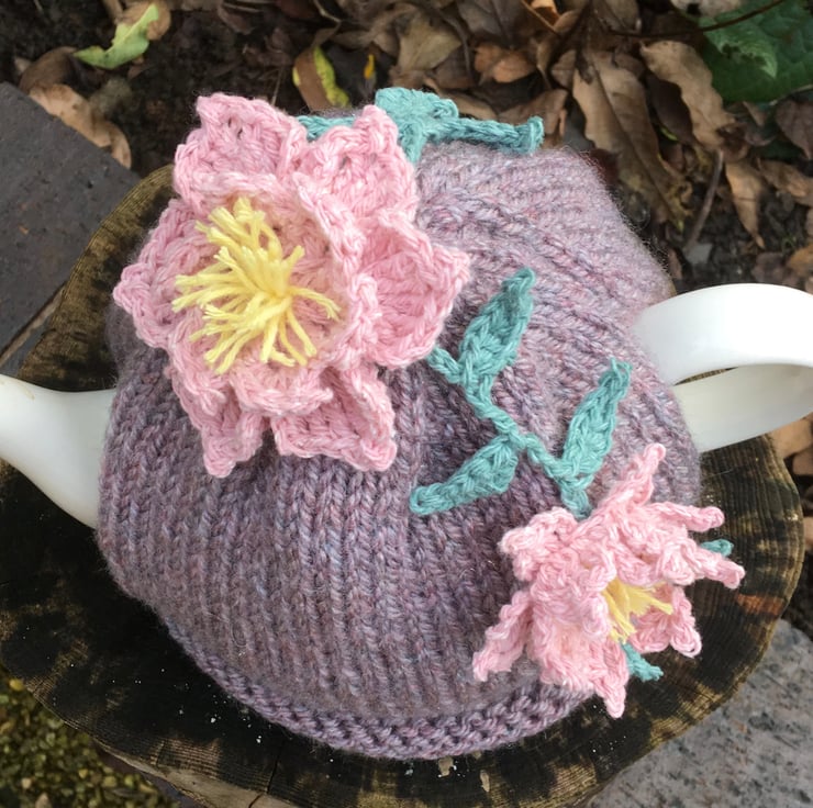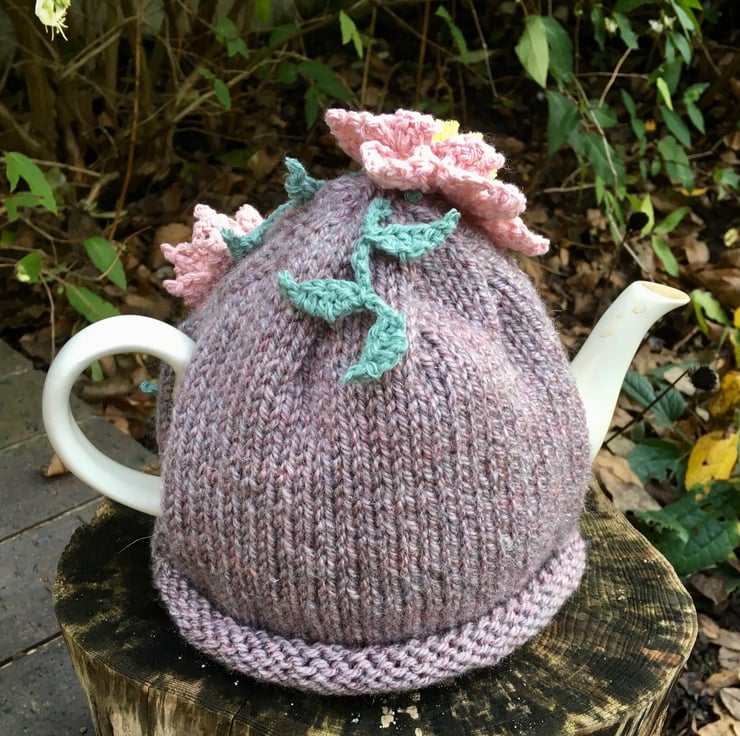 This Clematis flower tea cosy has a lovely hand knitted mauve base which is lovely and soft and slightly marled.