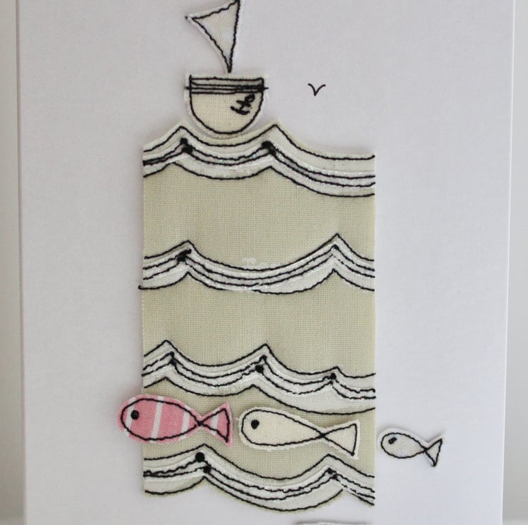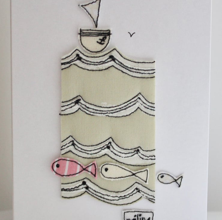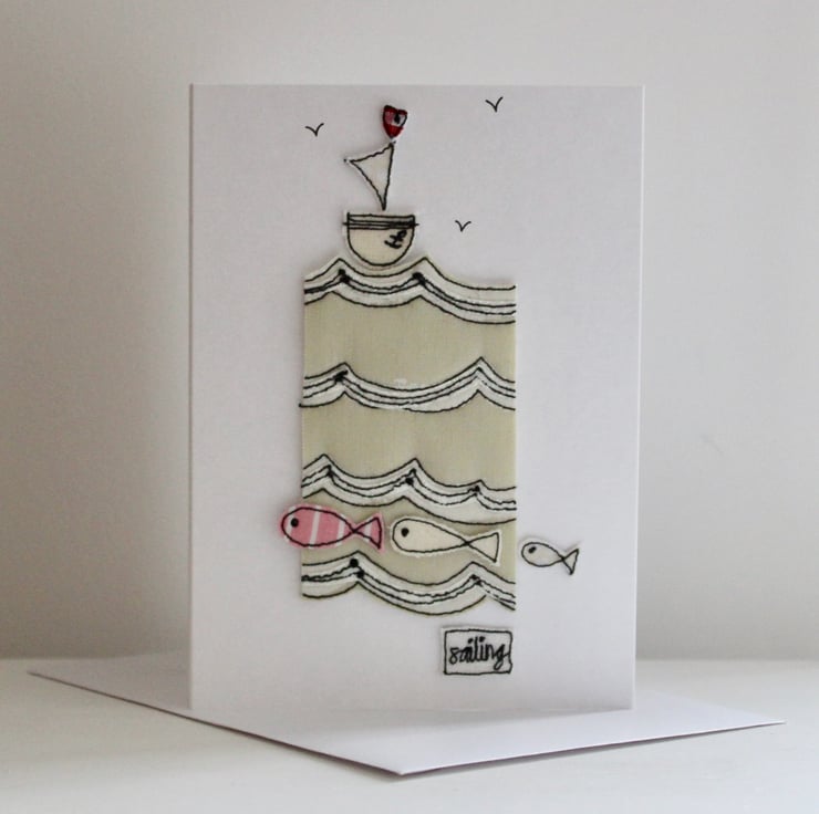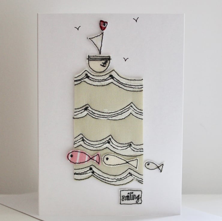 A sailing boat is floating on a scalloped sea, with three fishes, a sewn label 'sailing' and hand drawn birdies in the sky.