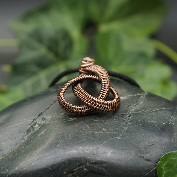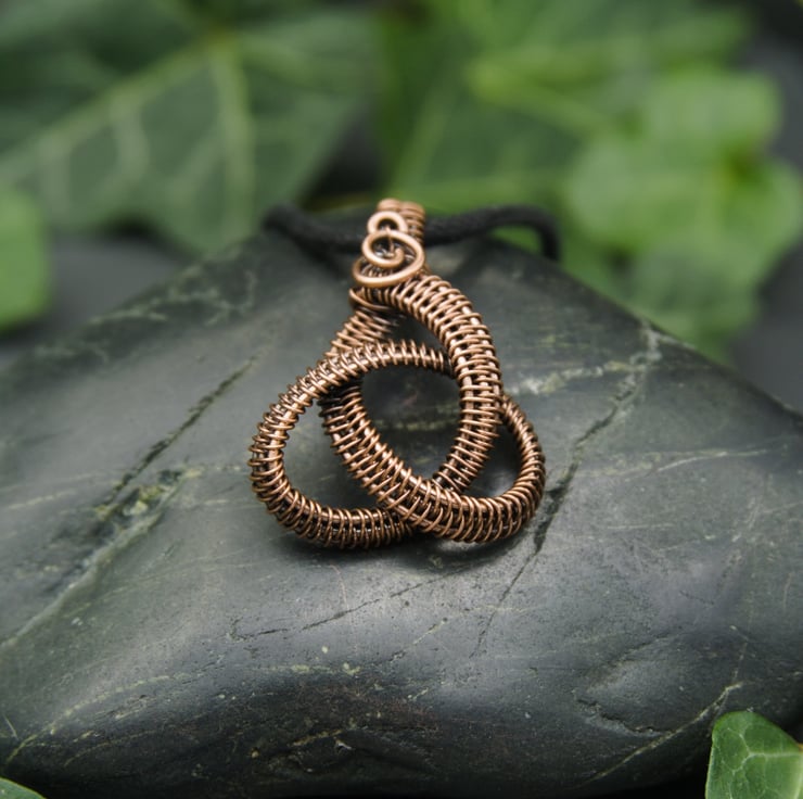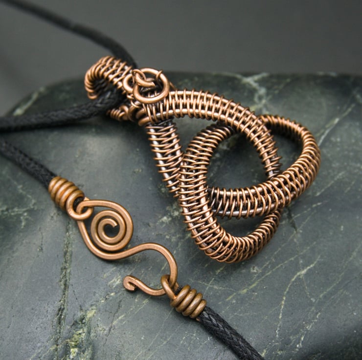 This three pointed Celtic knot pendant has been made using woven copper wire. Three pieces of 1mm thick wire have been woven together with the snake weave, with this long section then knotted together. I have then finished the pendant by curling the wire ends around the front of the bail, & then oxidising & polishing with a soft brass brush.