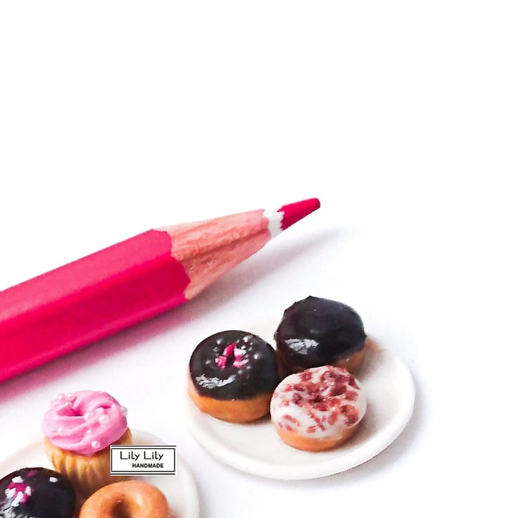 A selection of miniature doughnuts on a miniature clay plate all hand-crafted by Lily Lily Handmade using polymer clay. The doughnuts include a chocolate iced doughnut with strawberry and vanilla sugar topping, a chocolate iced doughnut and vanilla iced doughnut with chocolate shavings. The plate has also been handcrafted from polymer clay.
