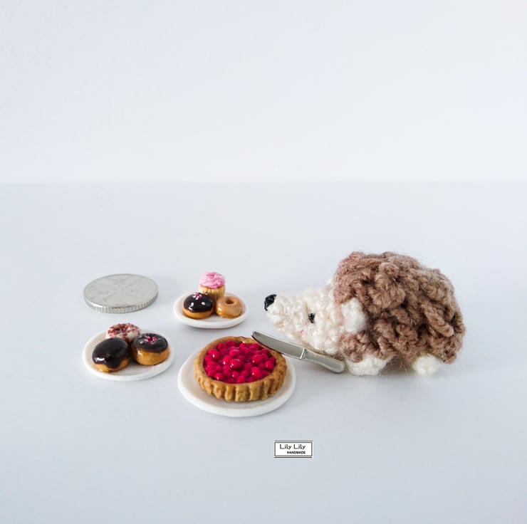 This plate measures approximately 1.8cm (0.7 in) in diameter (very tiny!) so is 1:12 scale. The width of each doughnut is approximately 0.6cm. The doughnuts are secured to the plate.