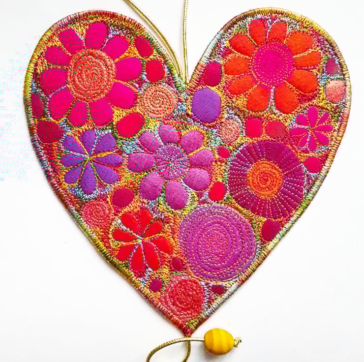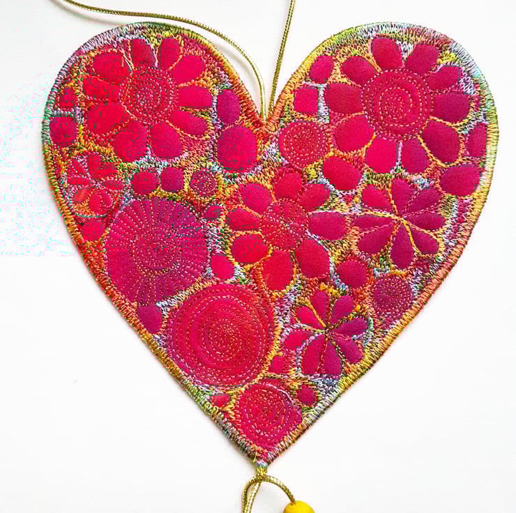 Made from layers of fabric including hand dyed Egyptian cotton and silk fabrics using the free machine embroidery style of sewing