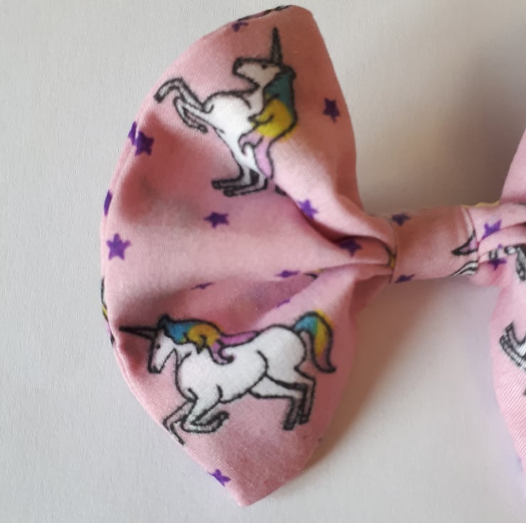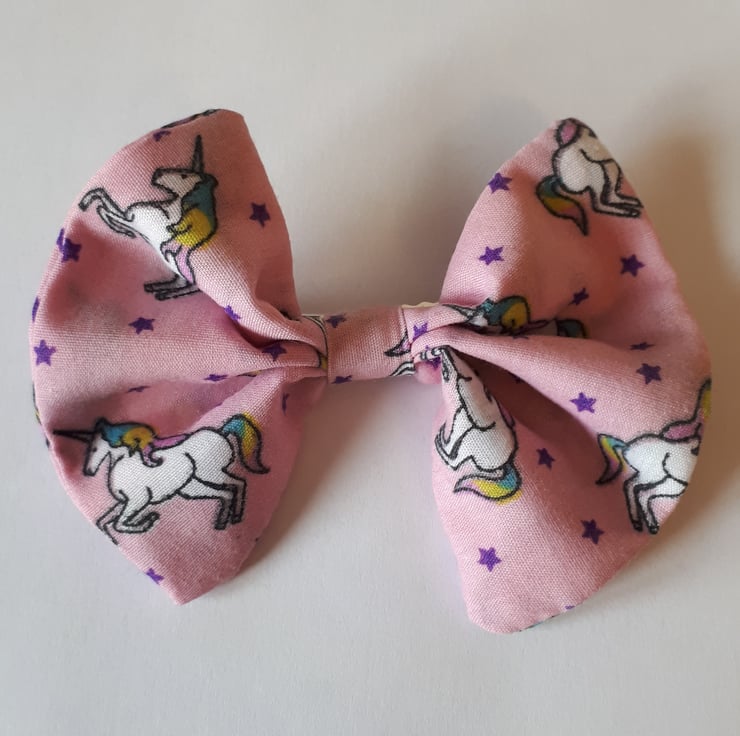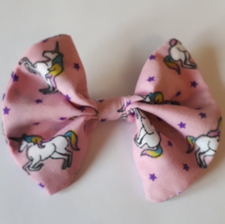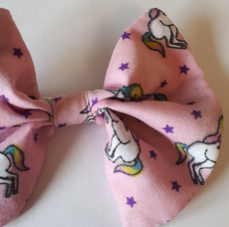 The bow measures 4" x 3" and is attached to a silver hair slide clip.