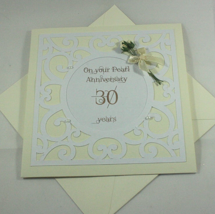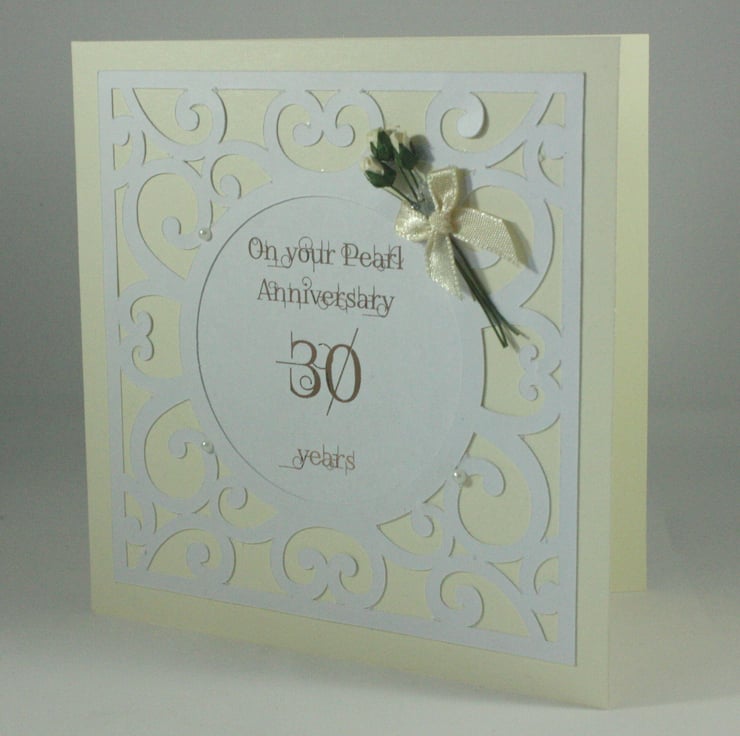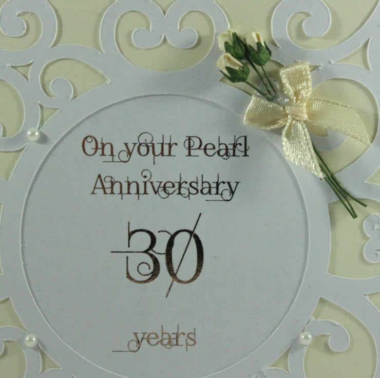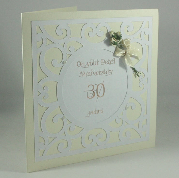 The card is made up of a cream base with a machine cut, square, white filigree pattern overlaid. The sentiment in the centre reads: 'On your Pearl Anniversary 30 years' and is foiled in bronze.