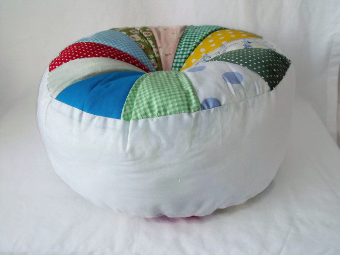 A nice big round patchwork sprocket pinwheel scatter cushion, large and comfy accent pillow.