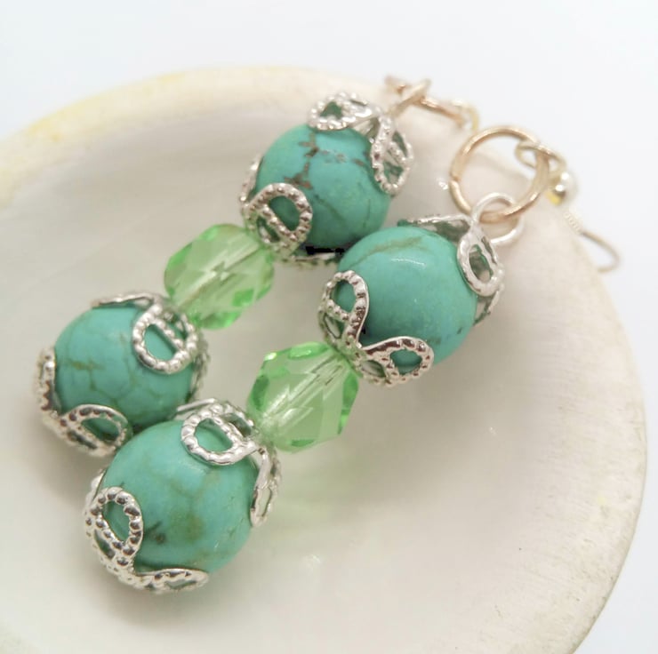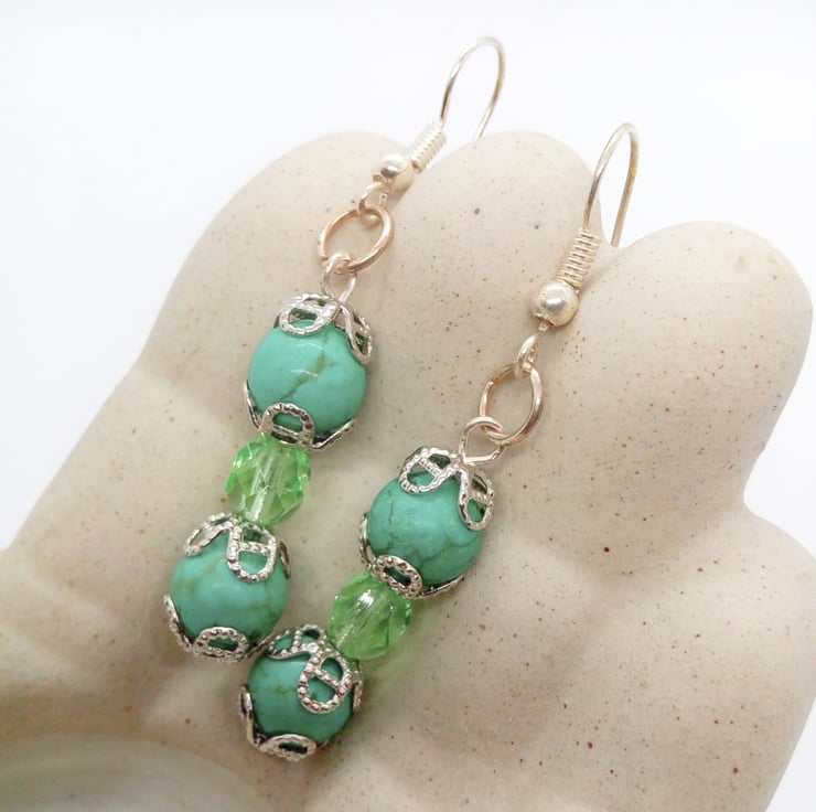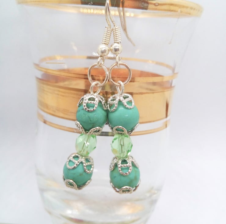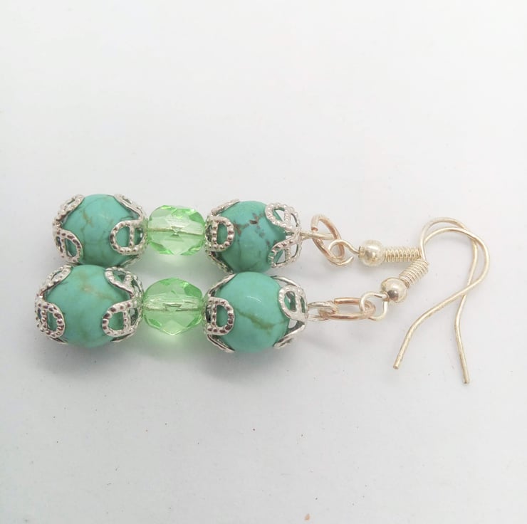 The earrings are made using 8 mm green dyed turquoise bead and 6 mm green faceted crystal bead with silver plated bead caps and silver plated ear wires. They have a drop of 3.5 cm.