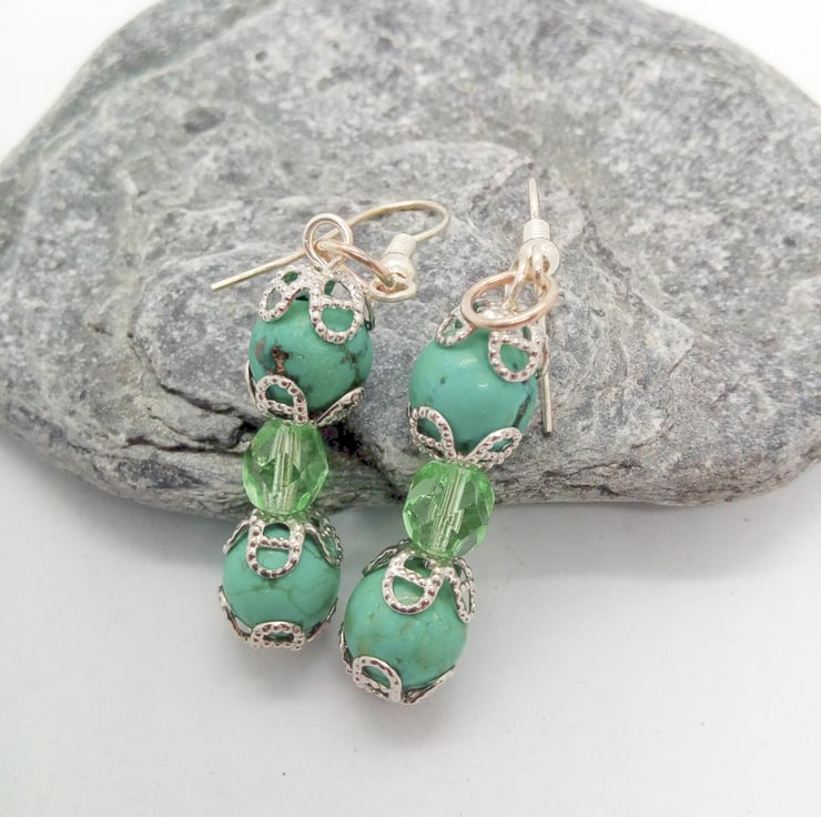 Green Dyed Turquoise and Green Crystal Earrings, Pierced Ears, Jewellery, Accessories, Semi Precious, Gift, Birthday, Christmas, Anniversary