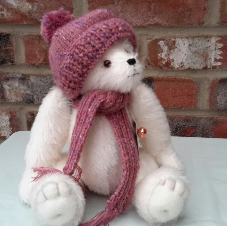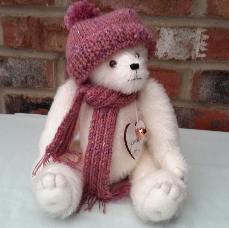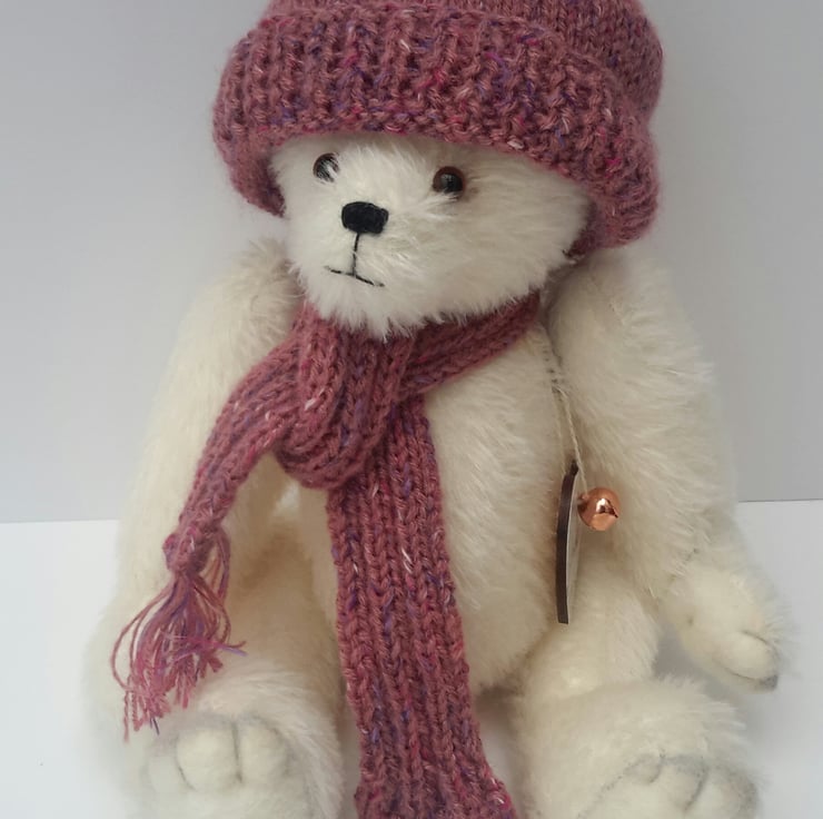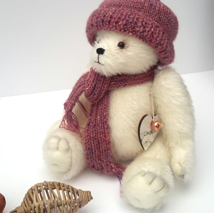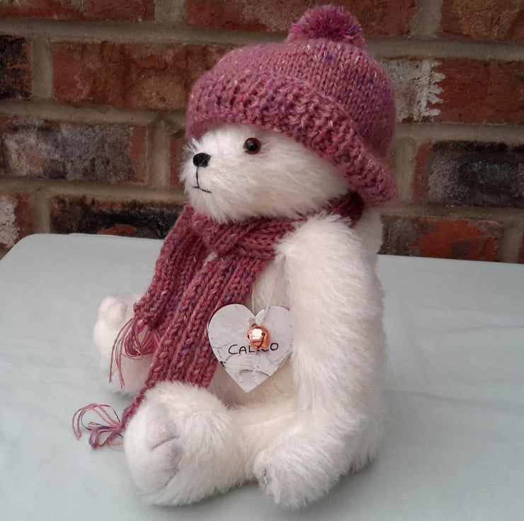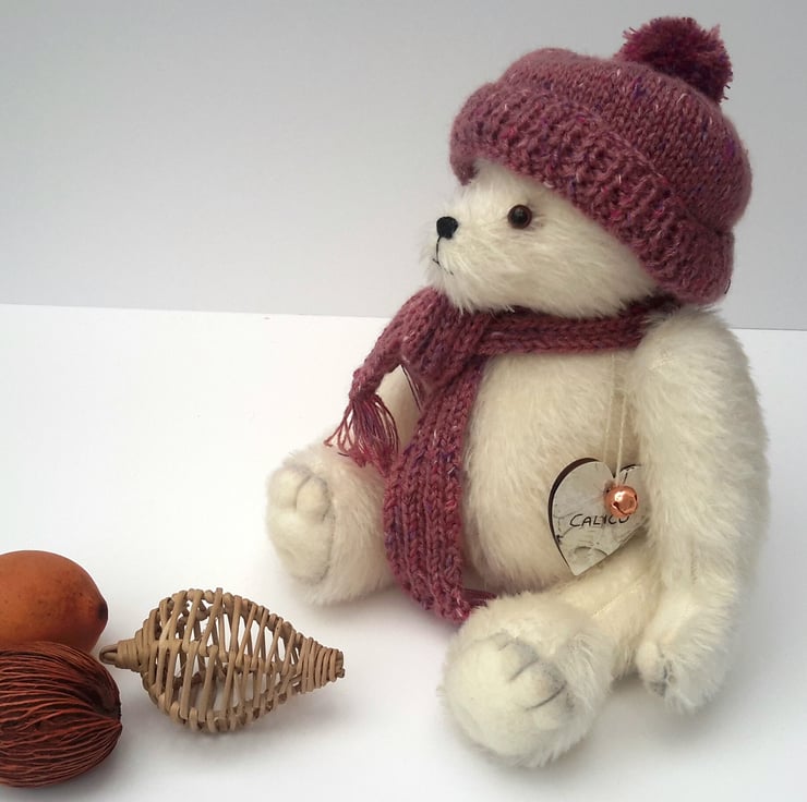 Meet Calico, a chubby 12" collectable mohair bear. Created and designed by Bearlescent, she is fully jointed and wears hand knitted accessories.