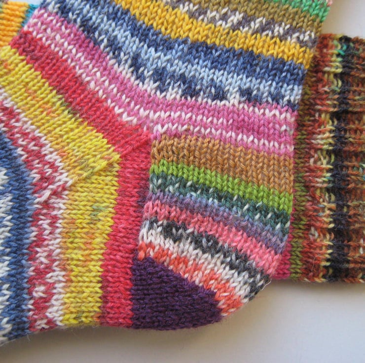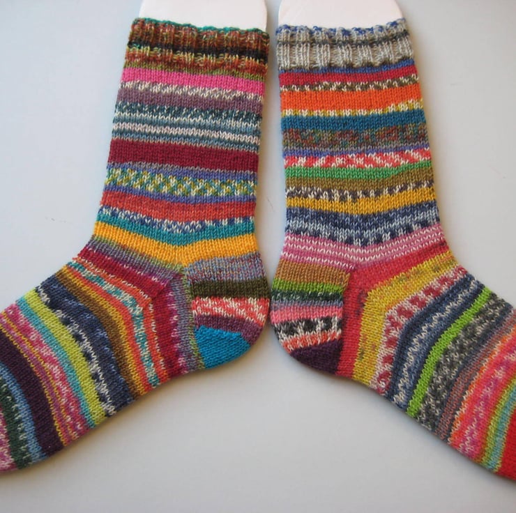 Hand knitted 'crazy' socks made from many different 4 ply self patterning sock yarns, 75% wool 25% polyamide. A truly unique pair of socks.