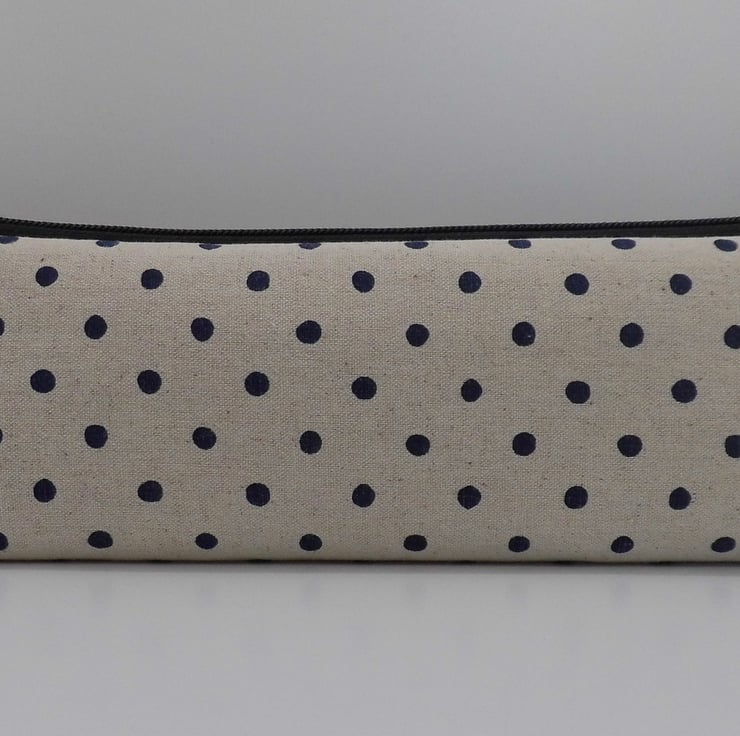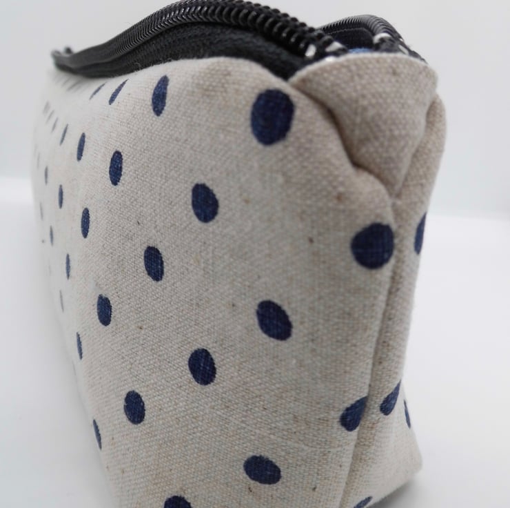 Made using a natural coloured calico type fabric with navy blue spots and lined with a blue cotton print.