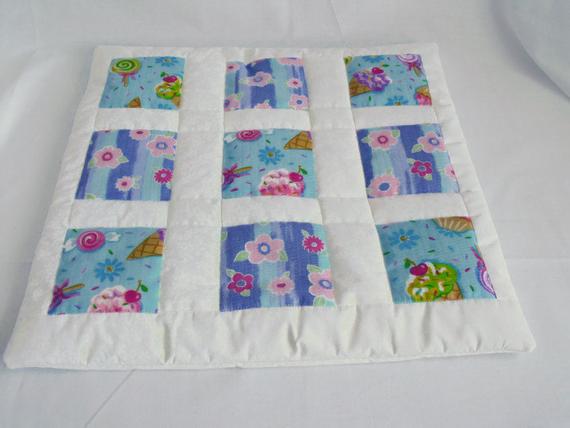 Sewn with turquoise and blue fabric depicting ice creams, lollies, flowers and buns.