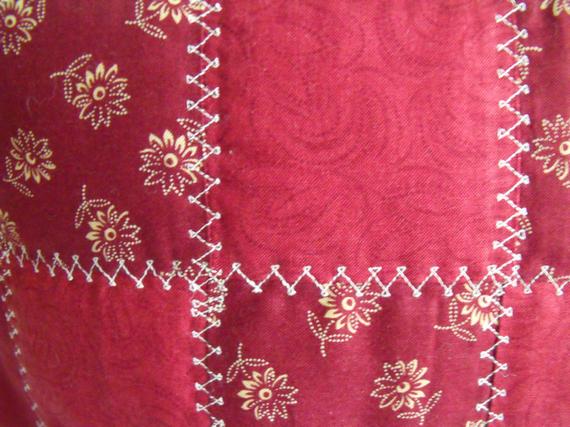 For the back I've used up-cycled cream tone on tone poly cotton fabric which I have doubled over for strength and edged with coordinating wine fabric.