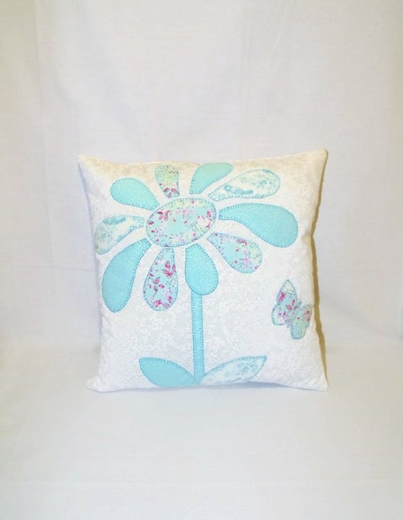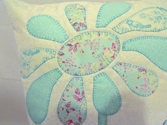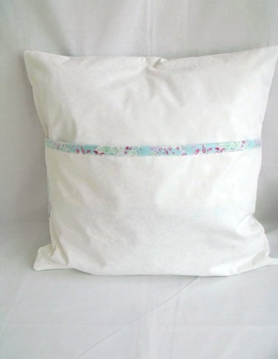 For this cushion cover I have used lots of shades of pale turquoise fabric with a splash of pink which is 100% cotton.