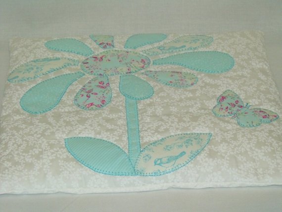 It has a large appliqued flower and butterfly which I've machine sewn a blanket stitch around the shapes.