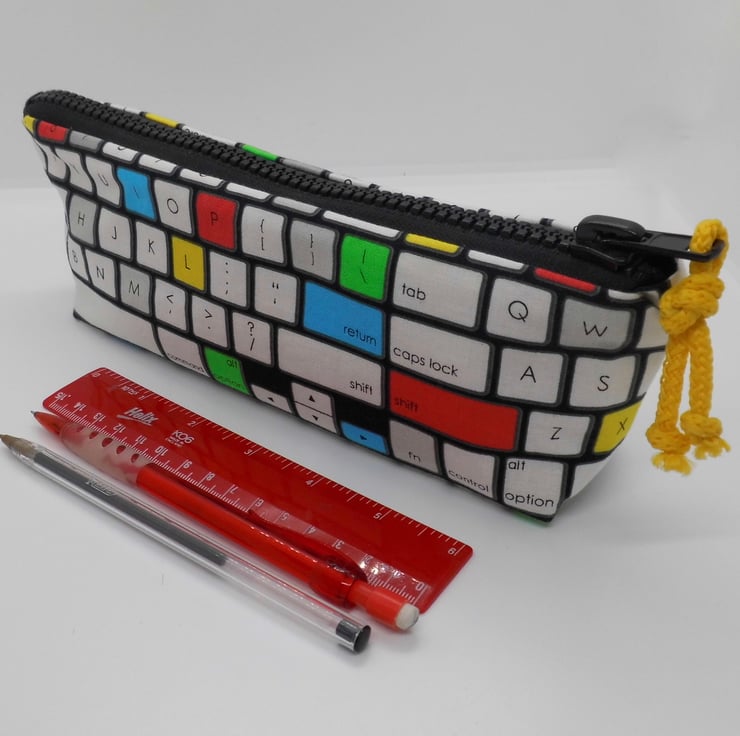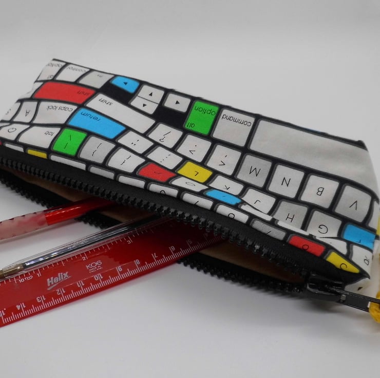 This zipped pencil case is made with a bright printed cotton with a keyboard design.