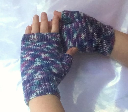 Soft fingerless mittens, in a variegated yarn of purple, green and white. The yarn is a blend of merino wool, silk and cashmere, and is very smooth and silky.