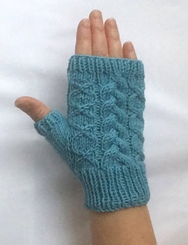 Sky blue fingerless mittens with a braid cable pattern on the back and a smooth, stocking-stitch palm. The wool is gorgeously soft.