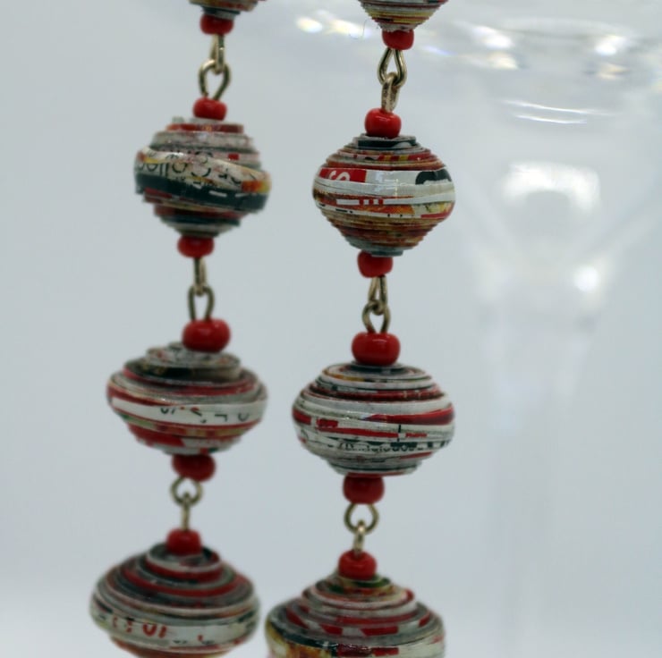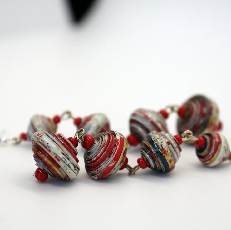I use recycled paper and I get inspiration from the colour of the paper and whichever pre-loved beads I could find to complement my design - This means that no two pieces are alike.