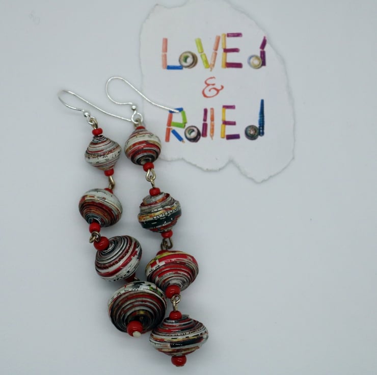 Multicoloured long dangling earrings. Made out of 'junk mail' paper which was cut into strips, hand rolled and varnished. Complemented with small red beads and mounted on silver plated ear hooks.