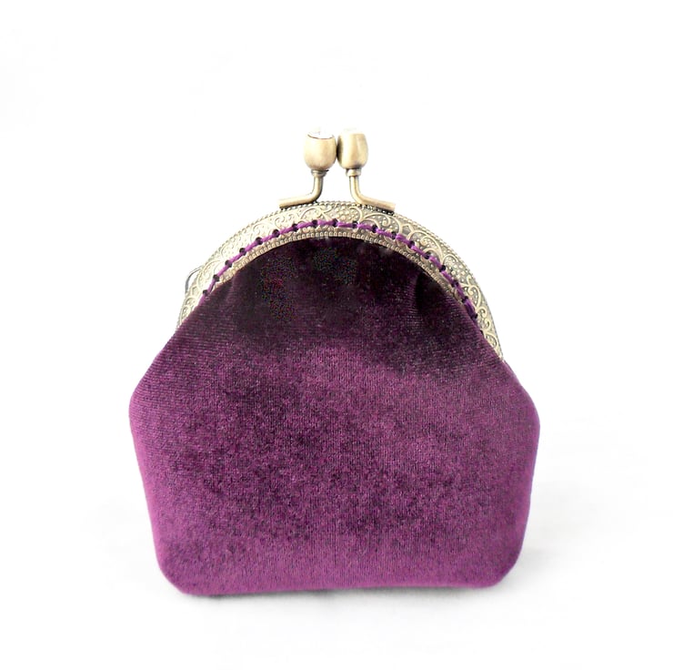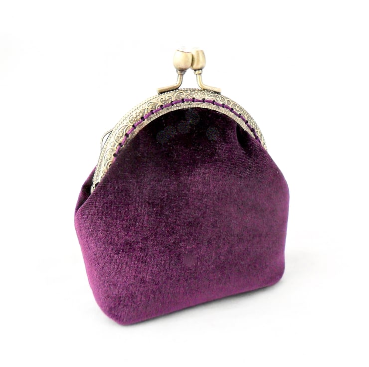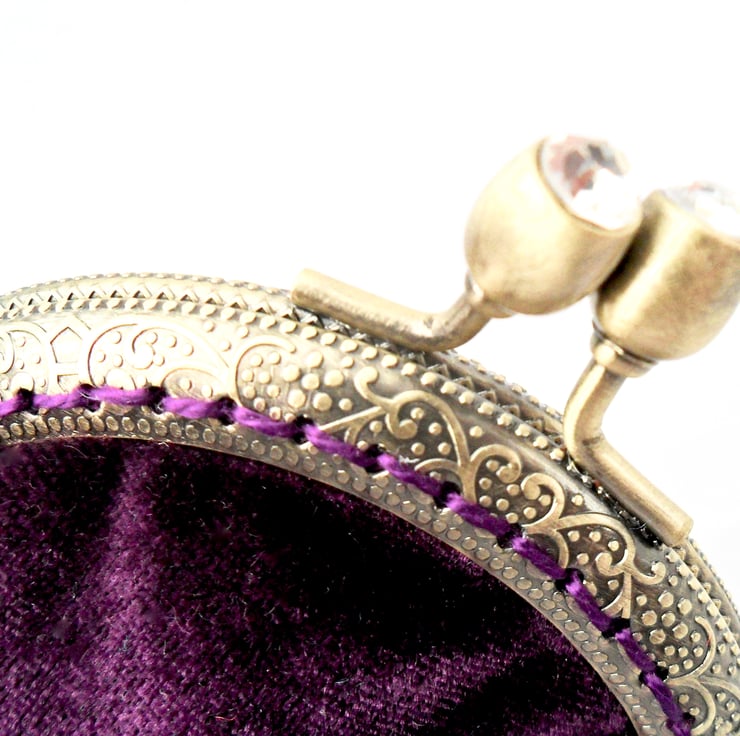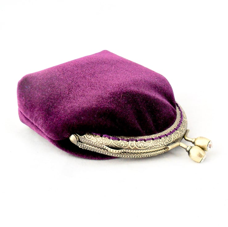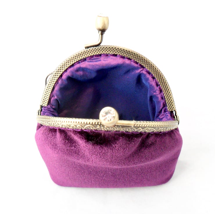 This luxury coin purse has been handmade in a stunning purple velvet, and lined in a purple taffeta that shimmers in the light. It has been both glued and sewn into the bronze - coloured frame with matching cotton thread and the diamanté' clasp adds a touch of bling. Perfect for those evenings out or special occasions this purse makes a wonderful gift.